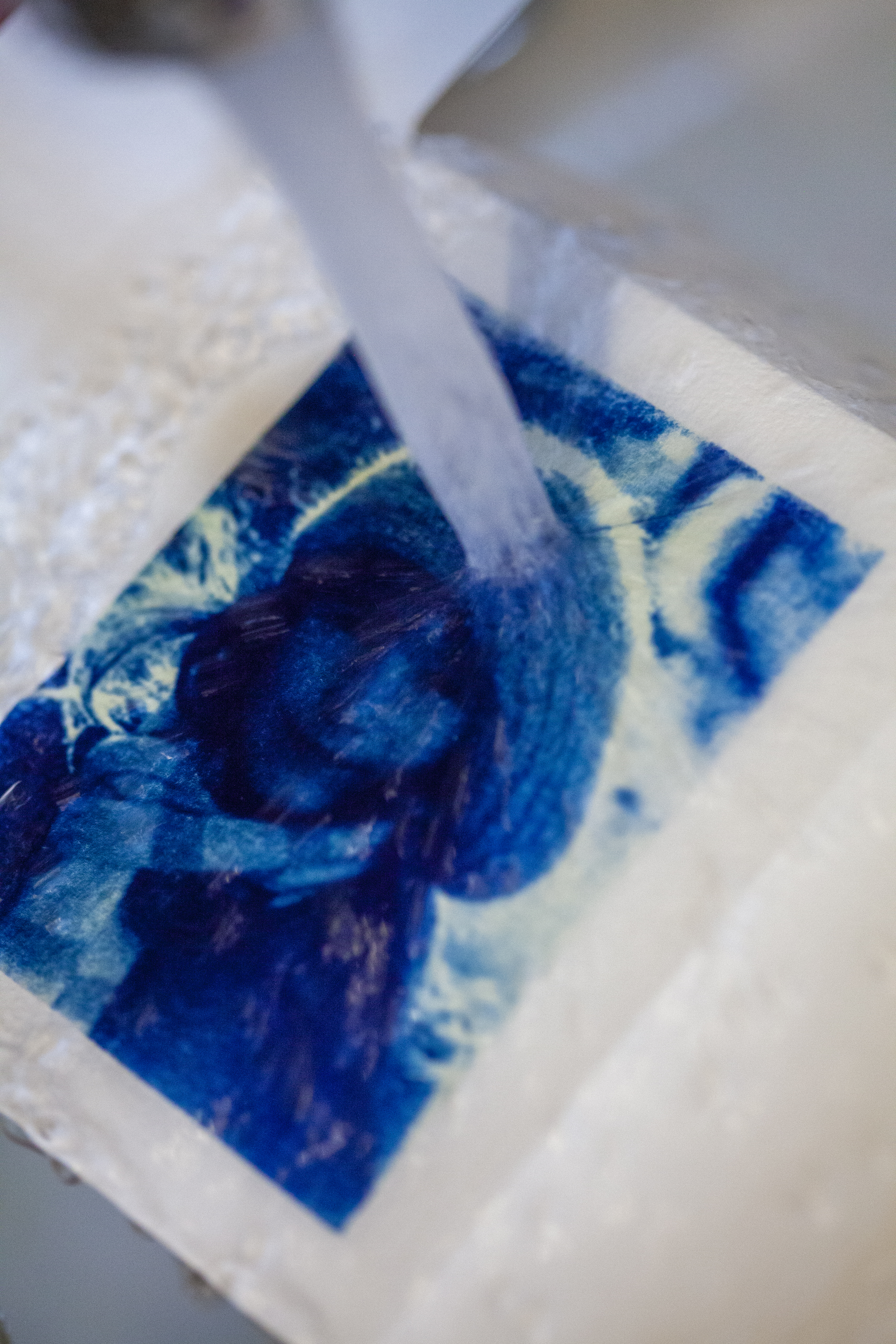 Je kan nog wat naspoelen onder de kraan (om bv. resten product/ gele waas) er af te spoelen. Hang of leg je print te drogen. De prints zullen traag oxideren tot hun finale blauwe kleur na 24 uur.