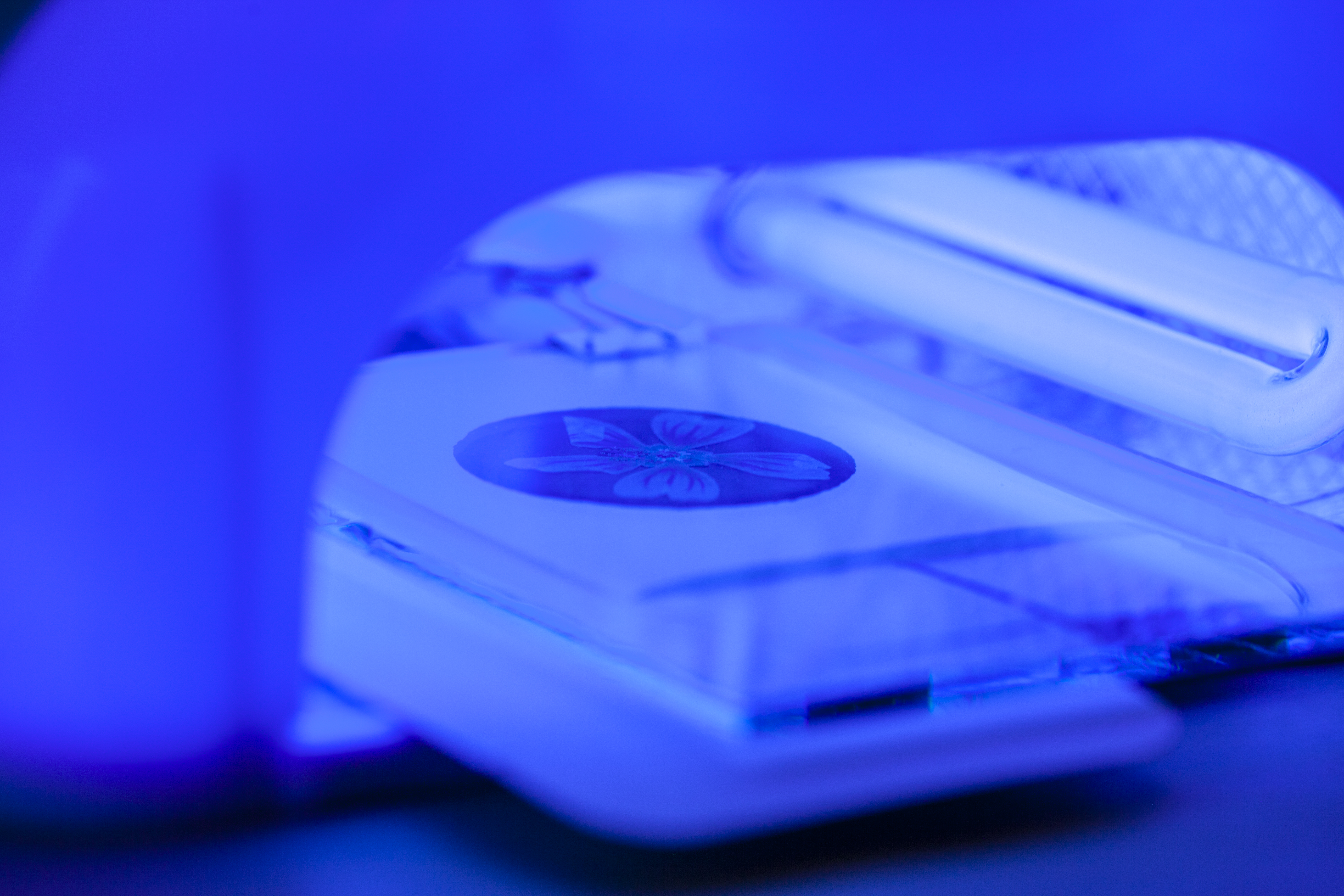 Laat je werkje liggen: in de zon ongeveer 10 à 20 minuten en onder een UV-lamp ongeveer 4 minuten. Haal de glazen plaat, het karton en de compositie (voorzichtig, kan je opnieuw gebruiken)er af en spoel in een badje met water. Je kan er eventueel enkele druppels waterstofperoxide toevoegen aan je water om een dieper blauw te krijgen.