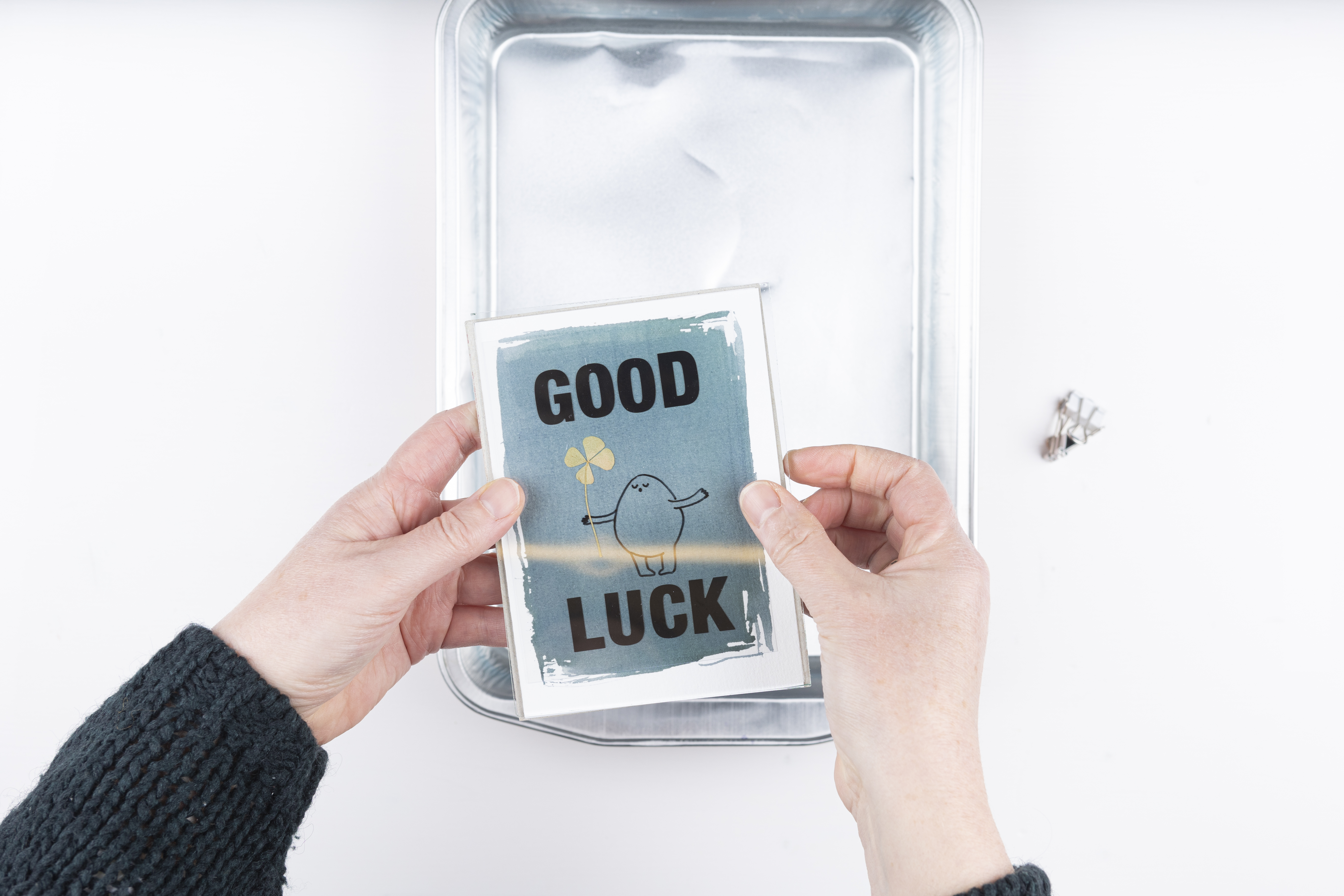 Leg een dik stukje karton onder je papier en een glazen plaat op je compositie en klem alles vast aan de zijkanten zodat het niet kan bewegen. Leg dit geheel nu in het zonlicht of onder een UV-lampje.