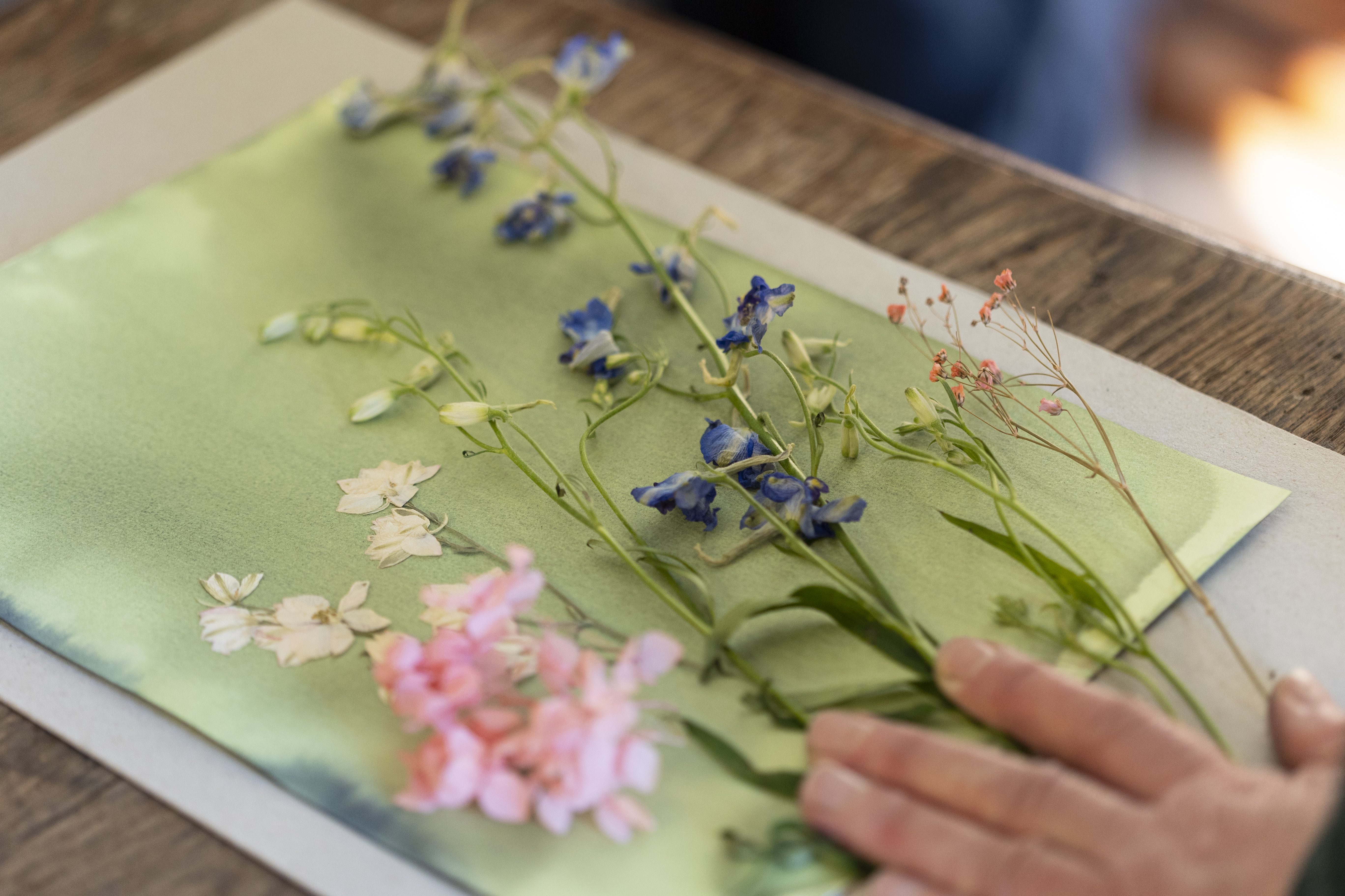 Na het drogen leg je een compositie op je papier van gepeste bloemen, pluimen, gevonden voorwerpen,...of een negatief (meer uitleg in stap 6 ).