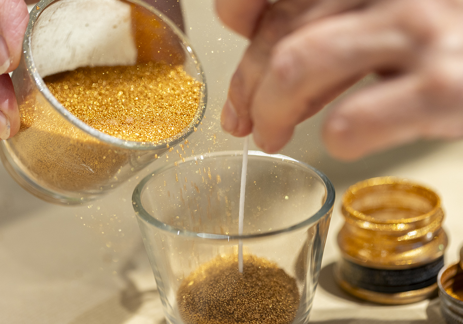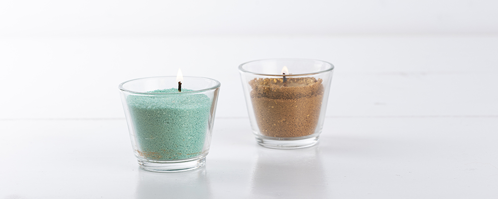 Vul een vuurvast transparant potje met het gemixte kaarsenzand. Plaats een wiek centraal zodat deze 0.5 cm tot 1 cm boven het zand komt en minimaal 2 cm van de rand verwijderd is. Verdeel vervolgens gelijkmatig het zand rond de wiek.