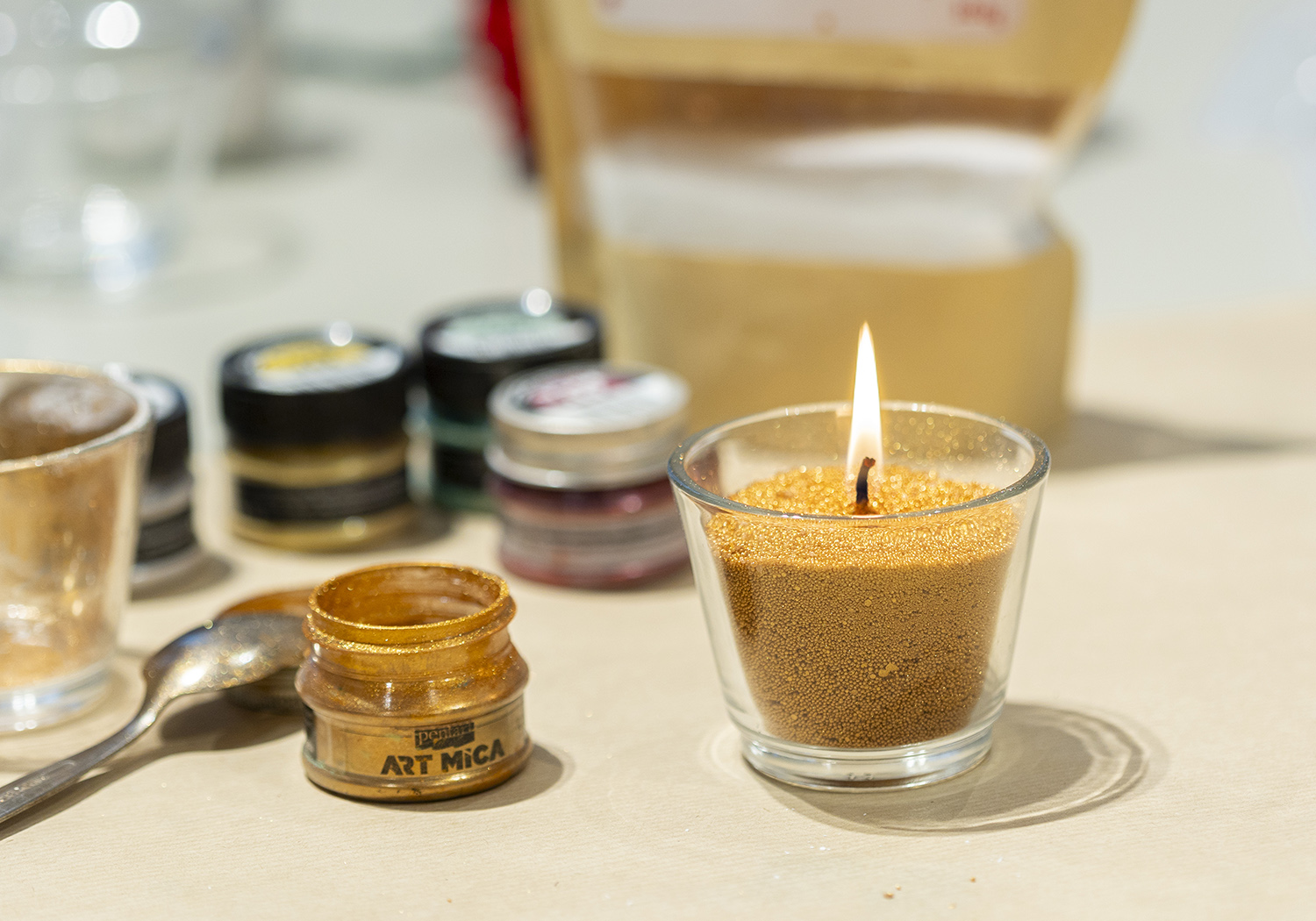 Vul een vuurvast object met Candleroxx-kaarsenzand. Mix het kaarsenzand met een klein lepeltje micapoeder totdat de kleur opgenomen is door het kaarsenzand.