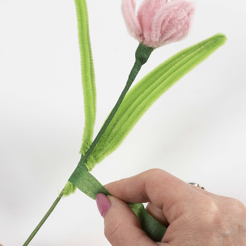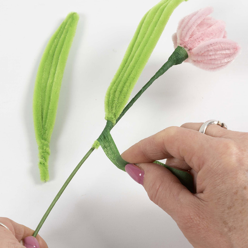 Lijm een blad op de steel en wikkel de bloementape er een paar keer omheen.