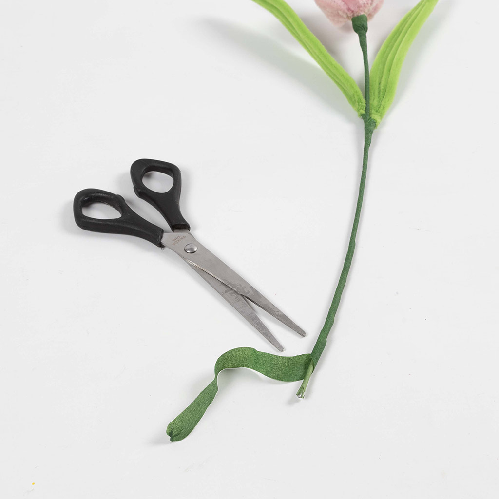 Breng een beetje lijm aan op de steel, wikkel de bloementape helemaal om het uiteinde en knip overtollige tape af.