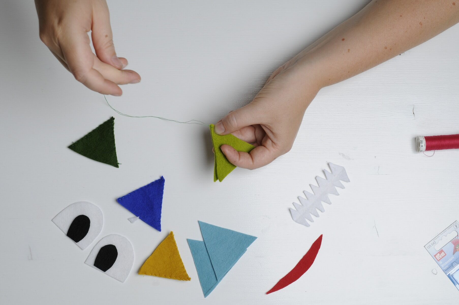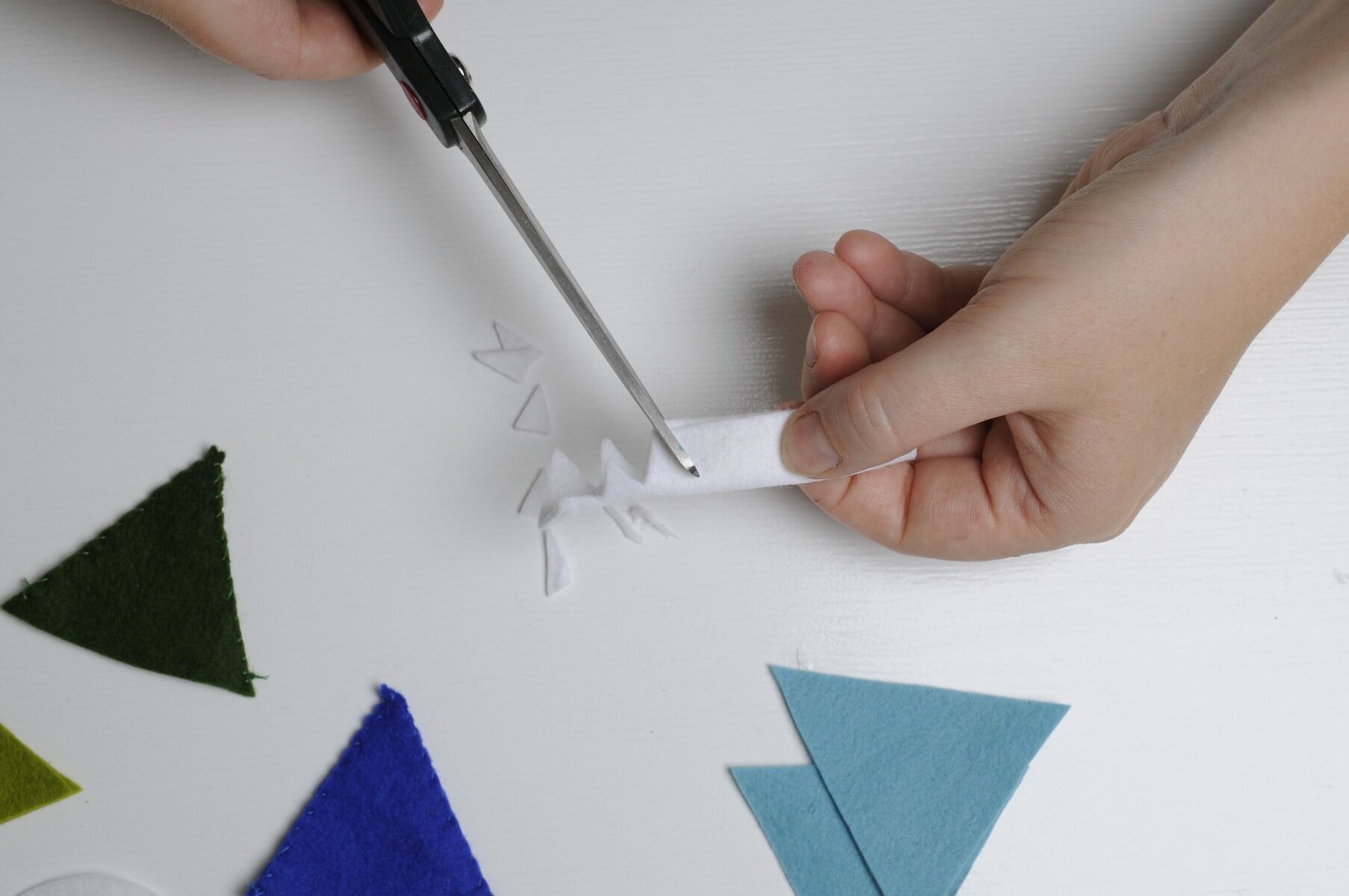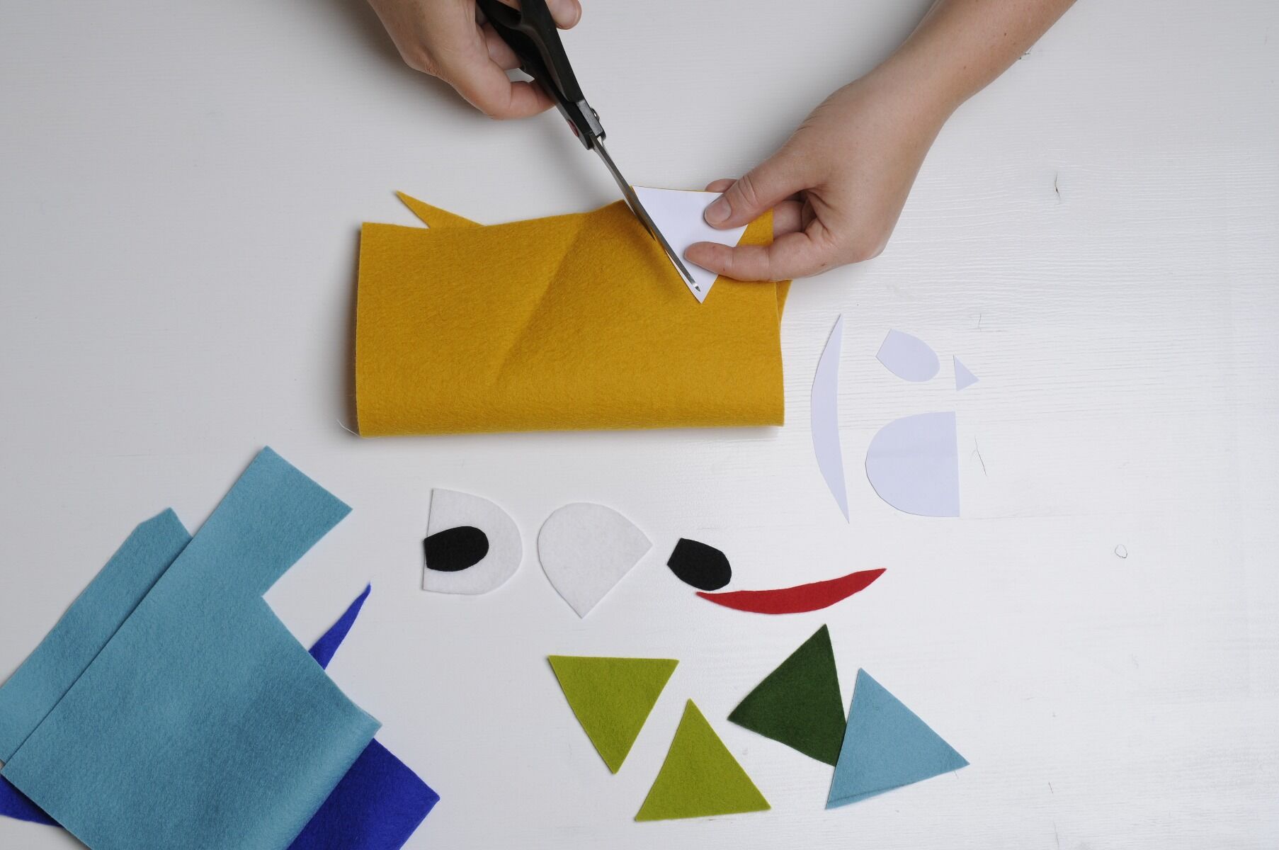 Download en print het patroon. Knip alle onderdelen uit. Knip 2x de driehoekvorm in vijf verschillende kleuren vilt.