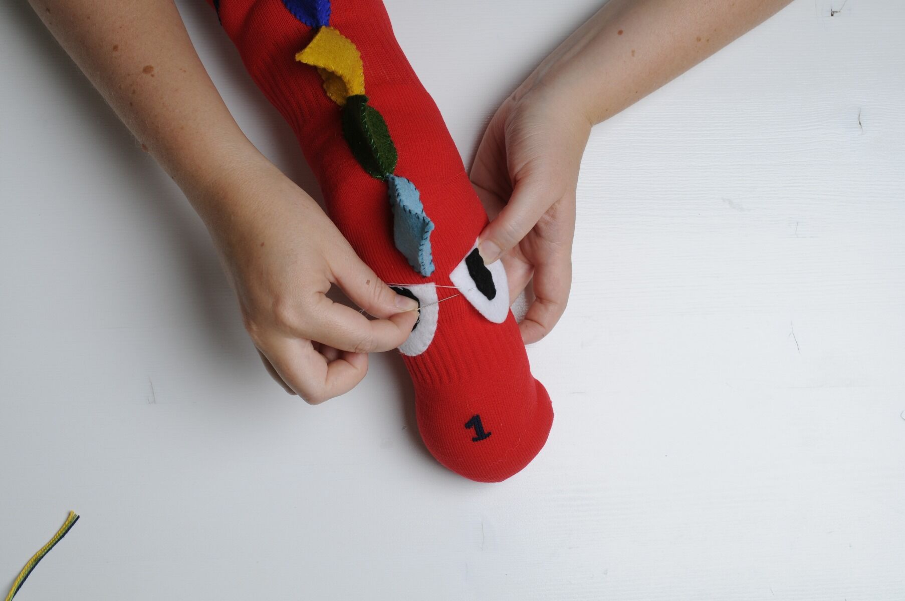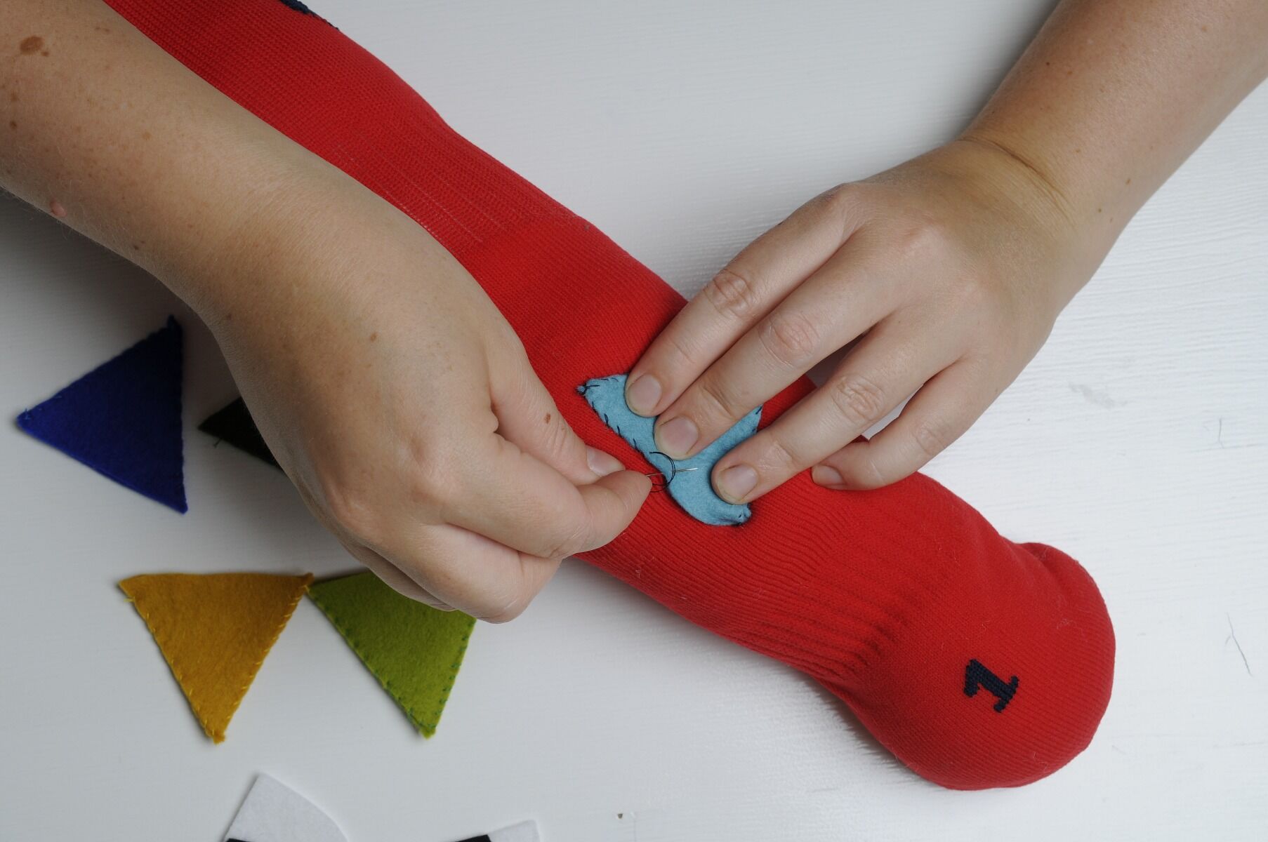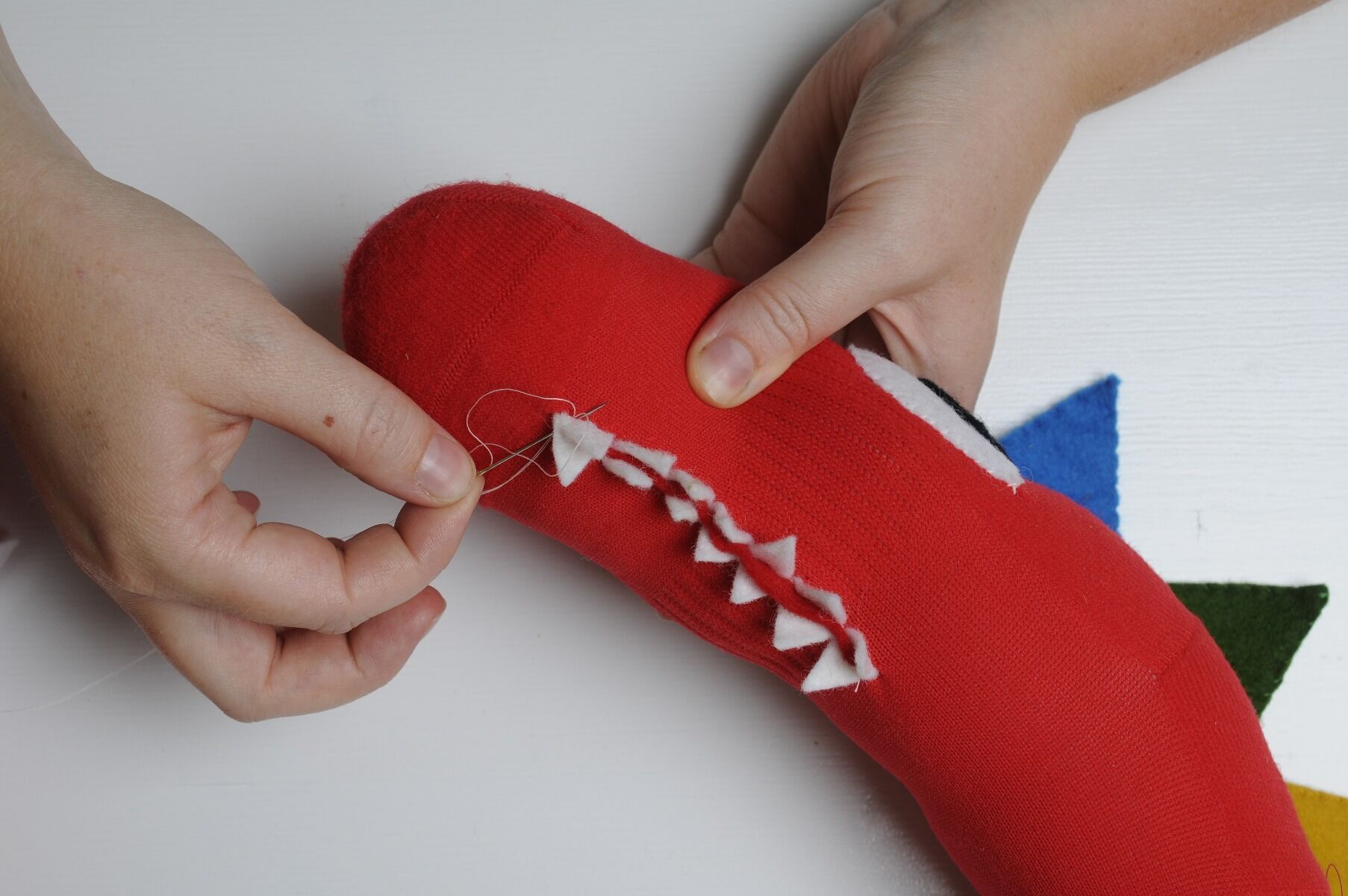 Naai eerst één kant van de open zijde vast, de tweede zijde naai je iets open op de sok. Zo blijven de driehoeken mooi als monster pieken recht staan.