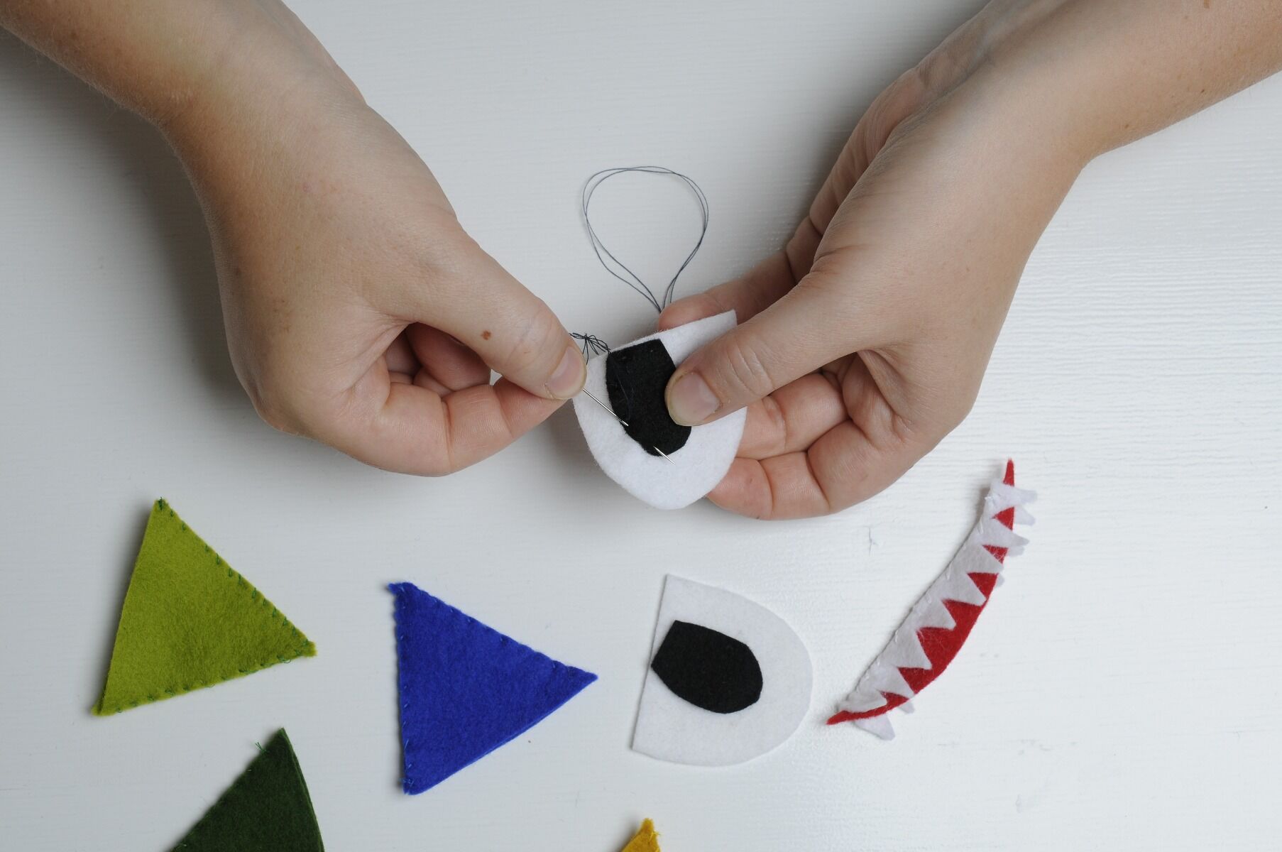 Knip uit de witte en zwarte vilt twee ogen en twee pupillen. Naai de zwarte pupillen vast op de witte ogen.