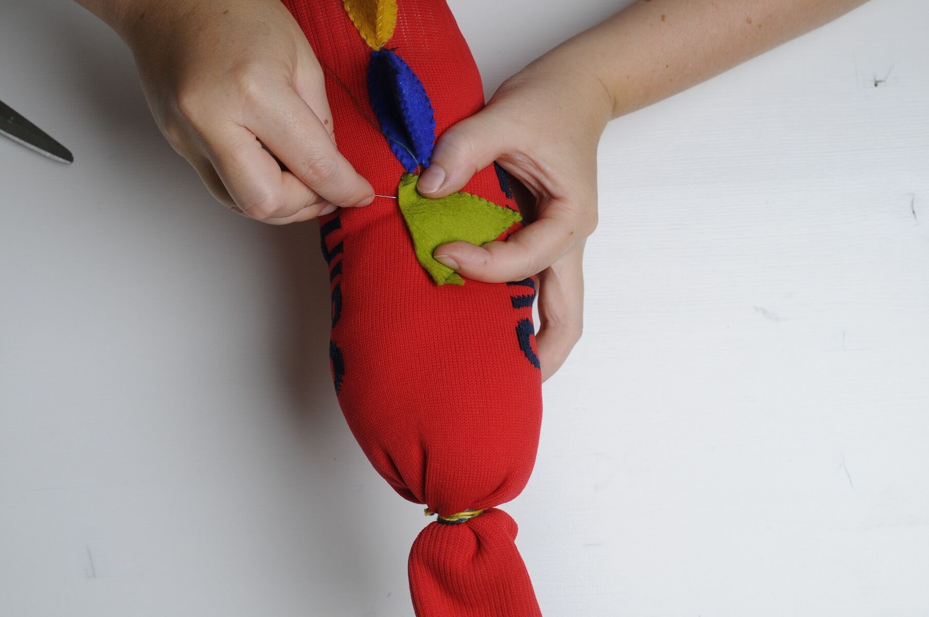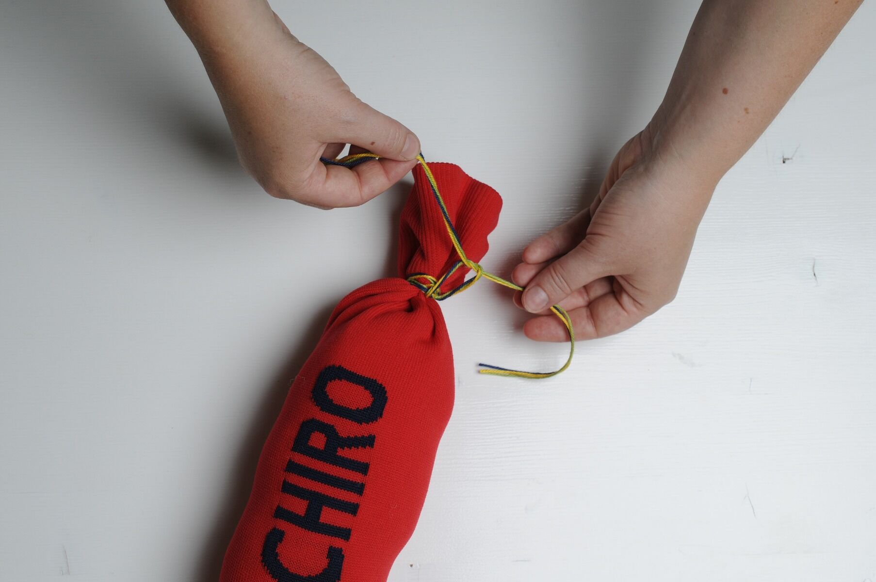 Neem enkele verschillende kleurtjes draad en wikkel dit om het uiteinde van de sok. Zorg dat de sok goed gesloten is!