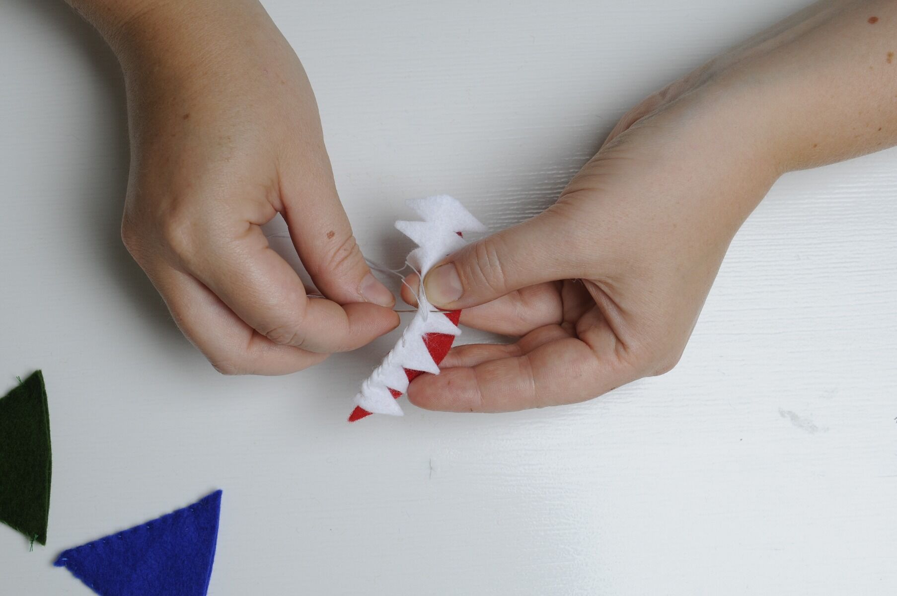 Naai de vijf verschillende driehoeken bovenaan de sok op één rij.