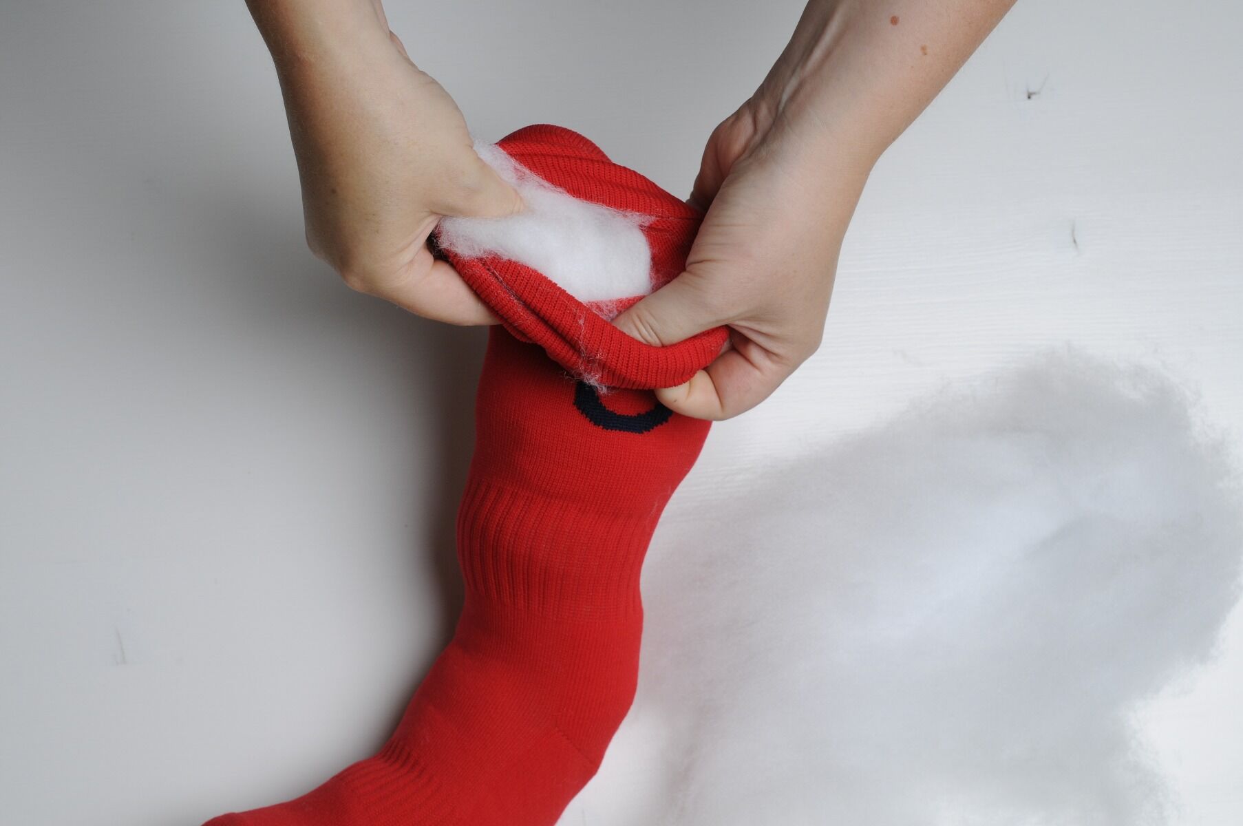 Vul de sok met het opvulsel. Voor een goede steun mag je de sok goed vol steken.