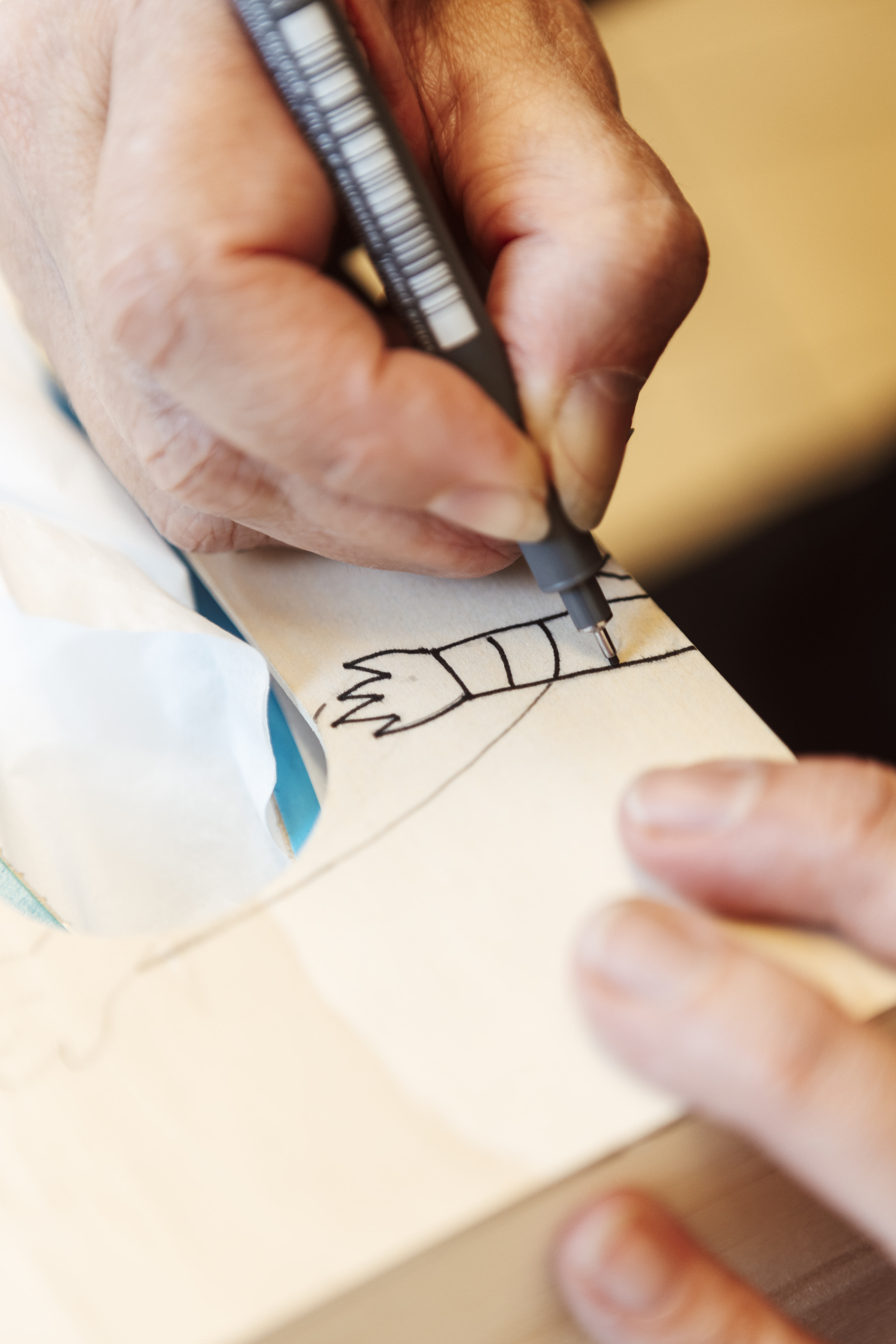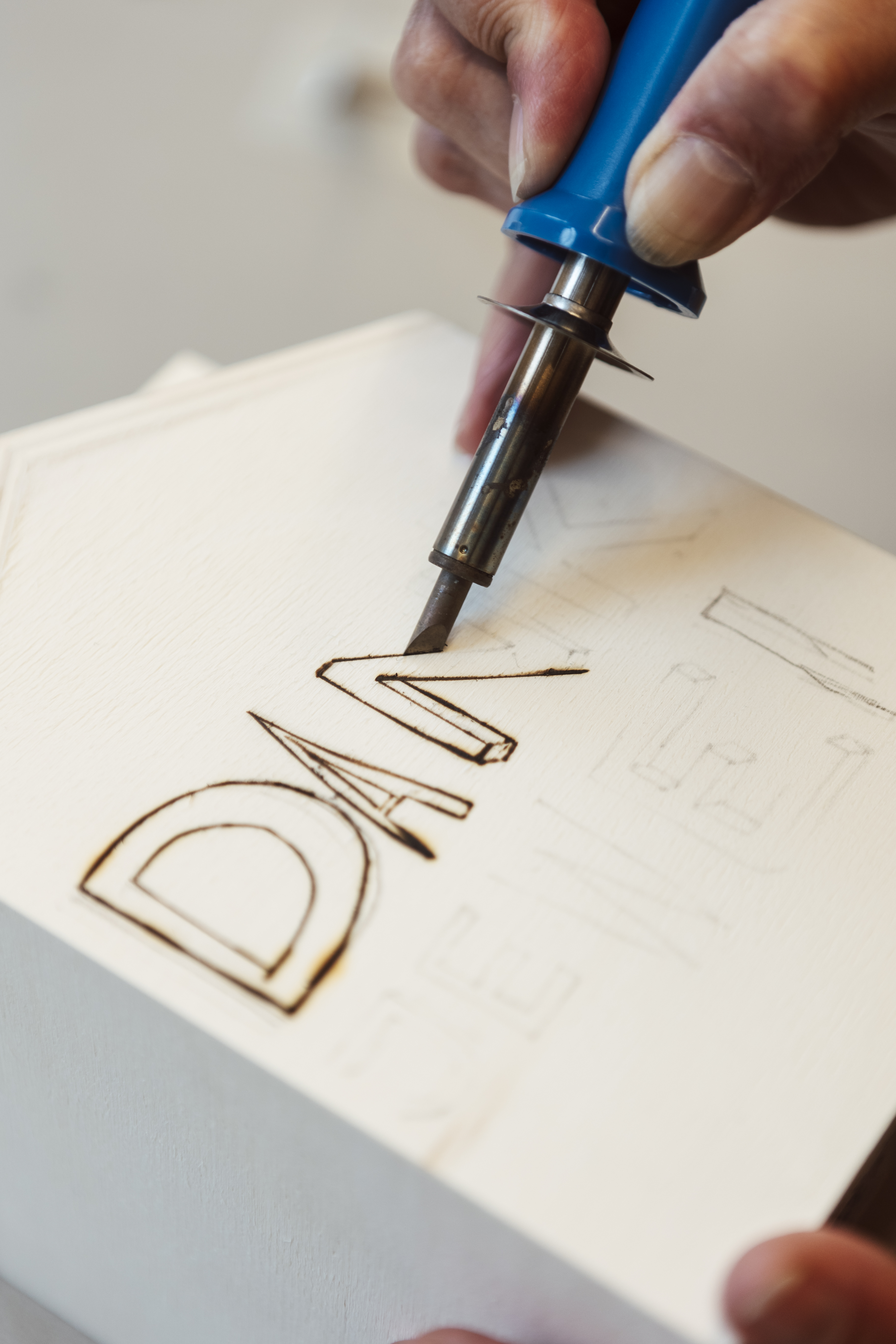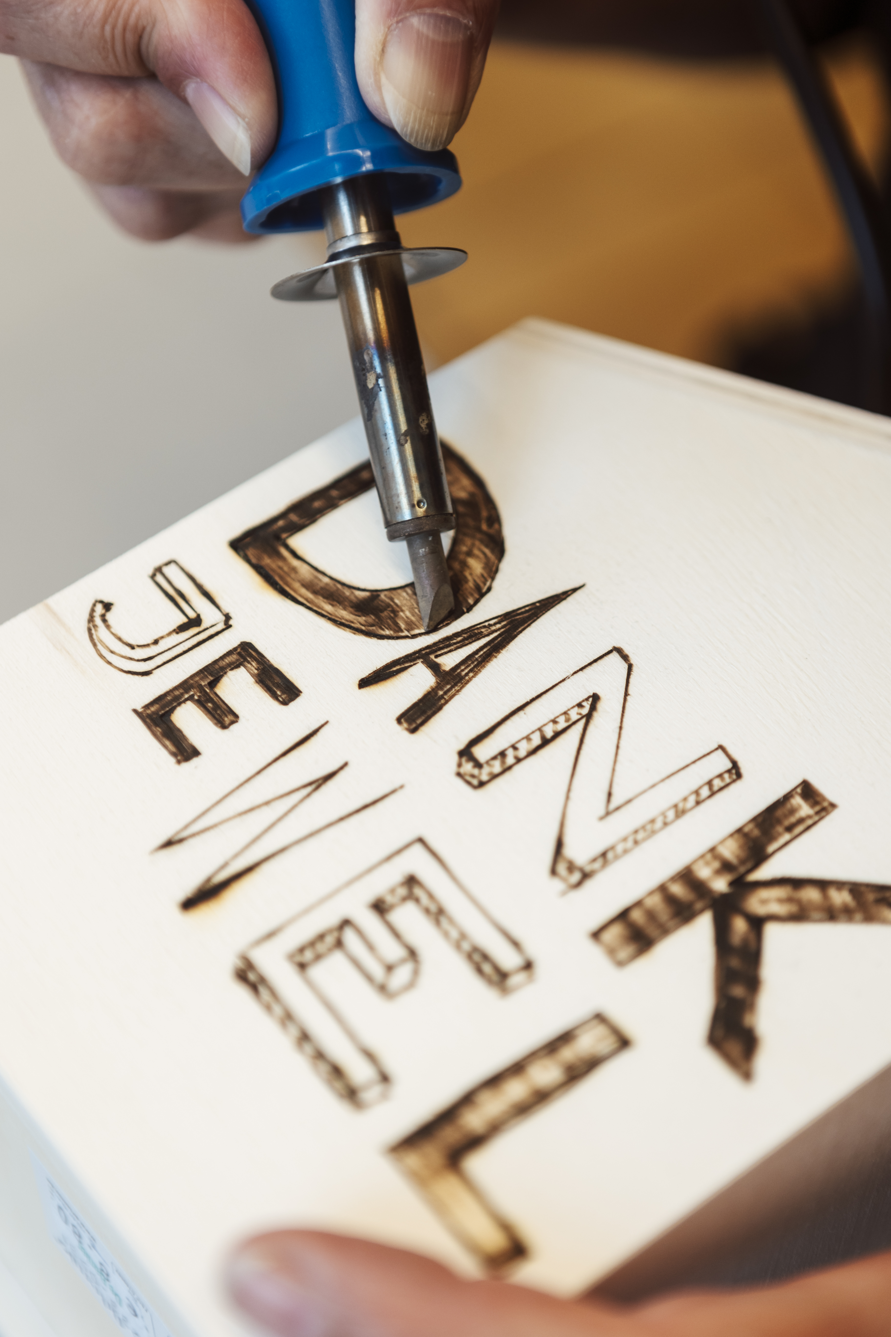 Vul de letters of tekeningen eventueel op met arceringen of puntjes. Niet te lang op dezelfde plaats duwen met je punt want dan brand je teveel weg en krijg je een grote zwarte plek.