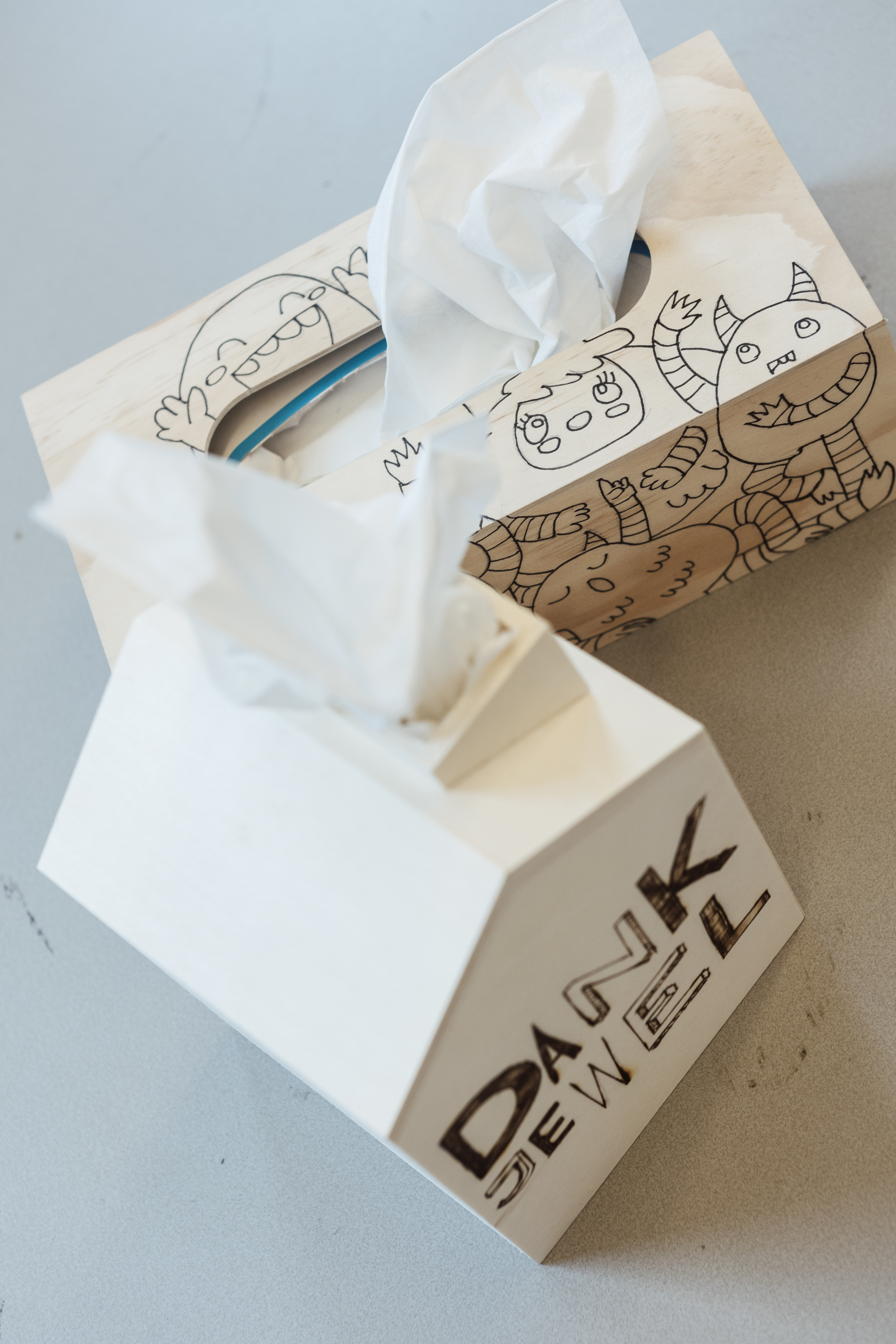 Steek een doos met zakdoekjes onder in je houten doos en klaar is je afscheidsgeschenk.