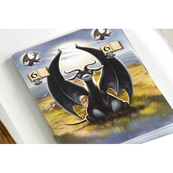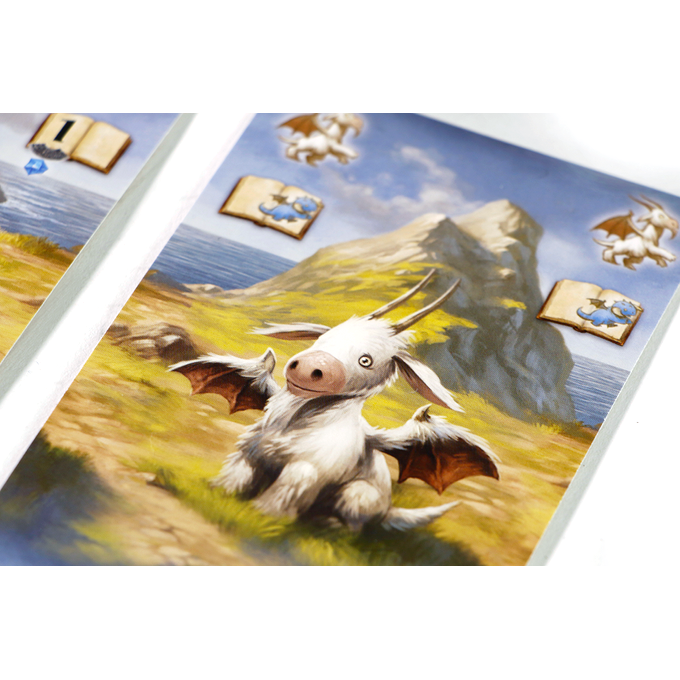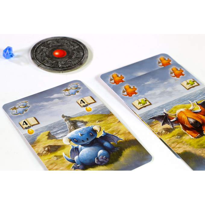 Noem de vormgeving van het spel gerust ‘geslaagd’. Bij het begin van het spel liggen 2 stapels kaarten klaar, met de rugzijde bovenop; ze lijken wel een opengeslagen magisch boek. Van elke stapel wordt 1 kaart omgedraaid, zodat de guitige afbeeldingen van 2 drakenjongen zichtbaar worden.
