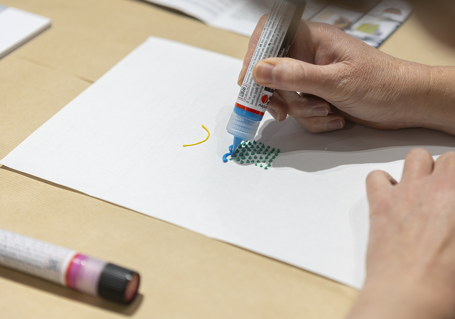Knip een driehoekje uit masking tape en kleef dit op je papier. Deze driehoek wordt uitgespaard en zal de baard van de Sint worden. Teken met de rode pen uit het squeegee setje een kleine driehoek erboven. Trek met de squeegee (rakel) van het setje de verf naar beneden tot net aan de bovenkant van de tape. Dit vormt dan de mijter van de Sint.