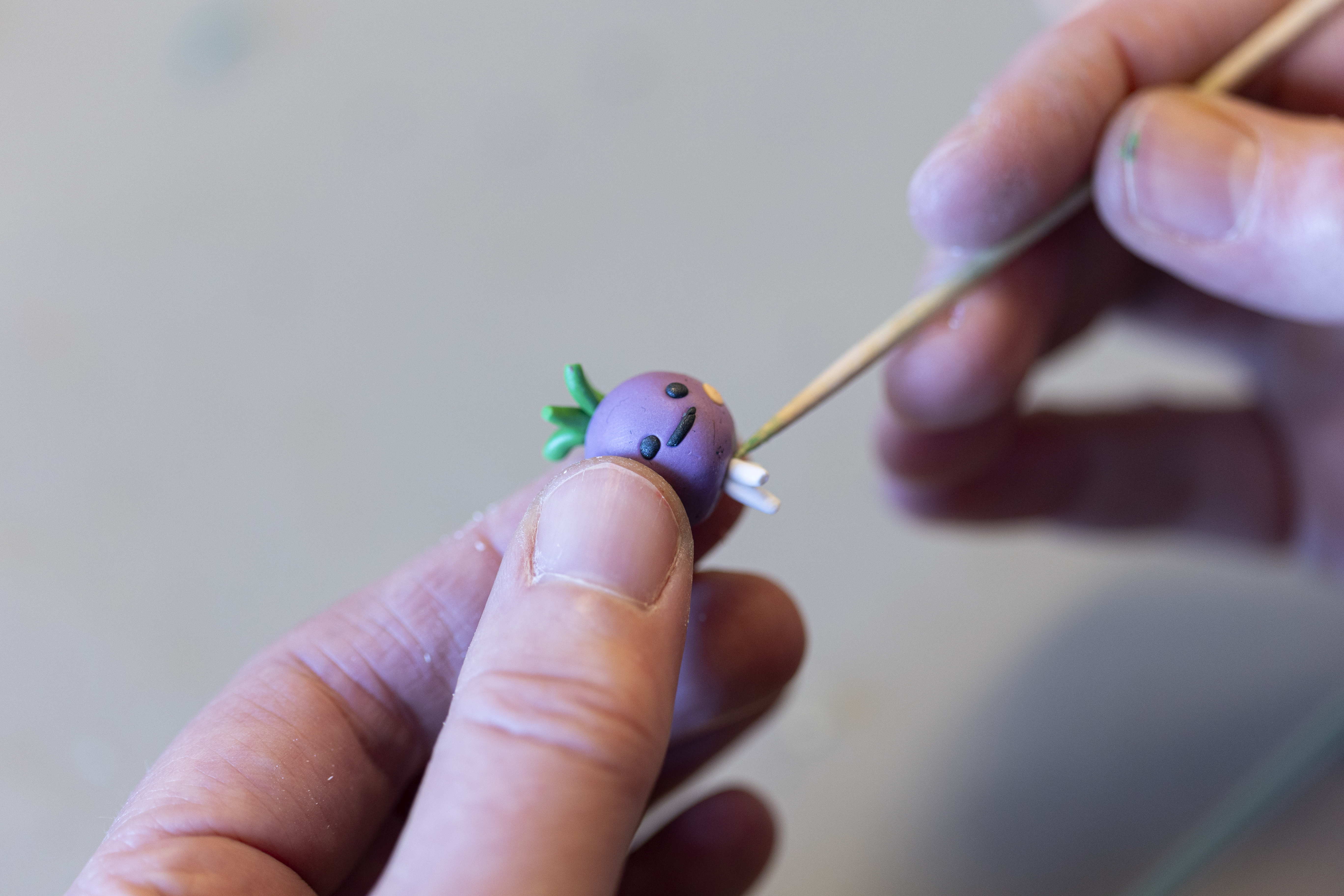 Knip met een kniptang een stukje van een kettelstift en steek deze aan de bovenkant in je Fimo figuurtje. Die wordt mee gebakken in de oven.