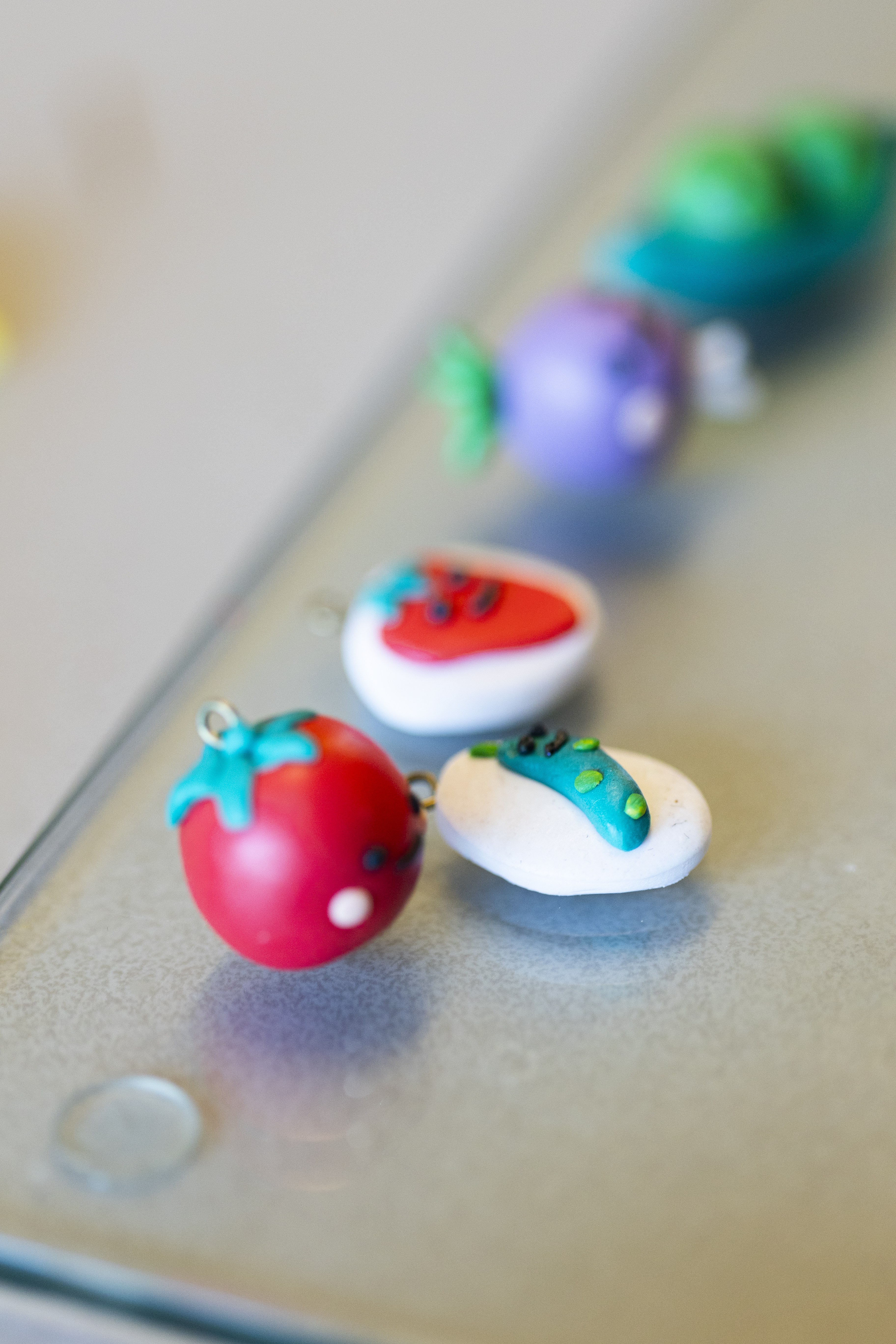 Maak de Fimo bedeltjes in de vorm van leuke fruitjes of groentjes. snij een stukje van de gewenste kleur Fimo, kneed even om beter te kunnen verwerken, rol plat en maak een bolletje. Begin dan te boetseren. Gezichtjes maak je met heel fijn gerolde zwarte Fimo en perzik gebruik je voor de kaakjes.