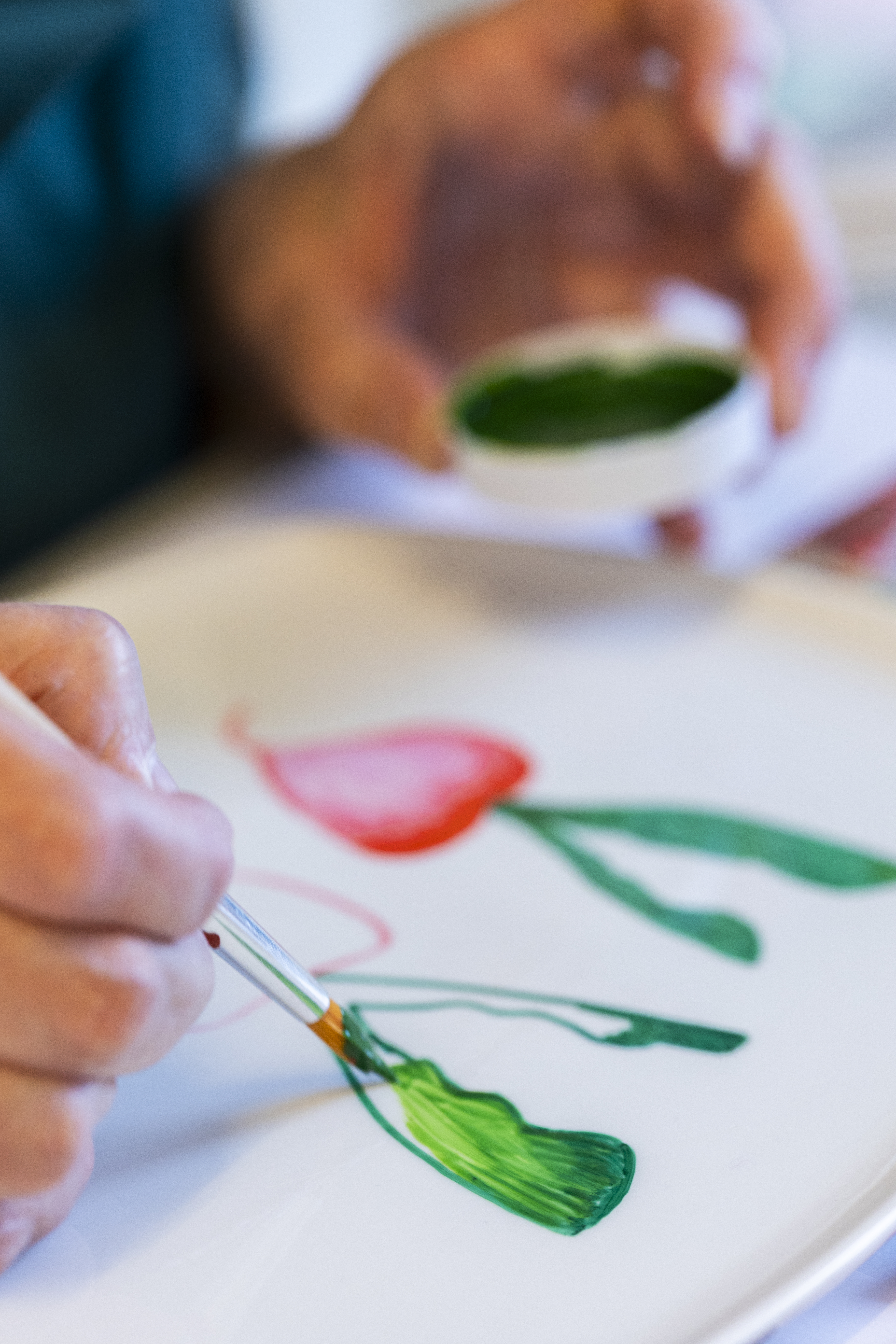Reken met de porseleinstift op je poseleinen bord, kom, schaal,... met de stiften kan je gemakkelijker rechte lijnen of fijne details tekenen. Je kan de verf en de stiften uiteraard ook combineren.