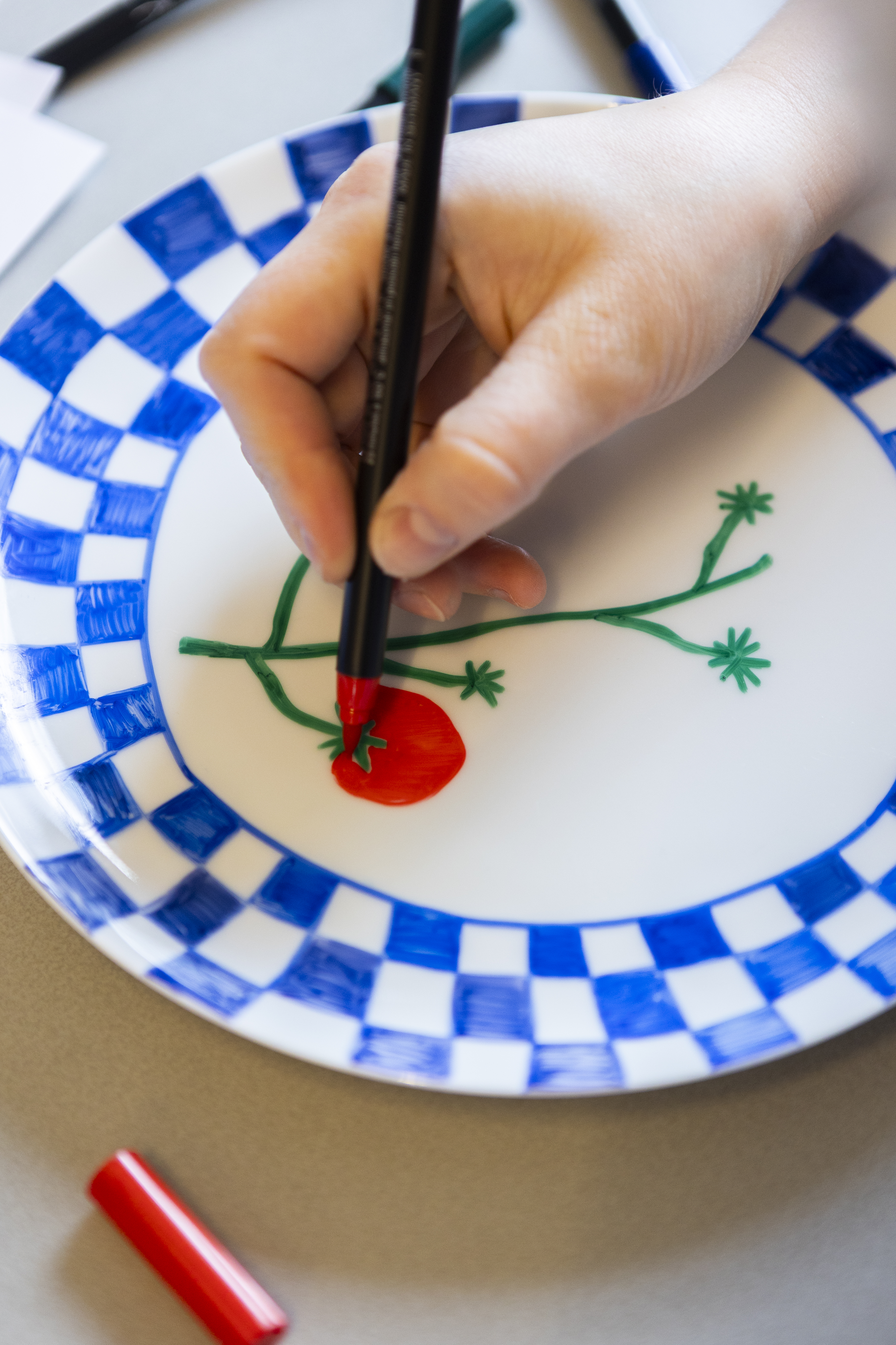 Schilder met een fijn penseel met de porseleinverf groenten of fruit naar keuze op je bord, schaal,...; je kan de kleuren mengen.