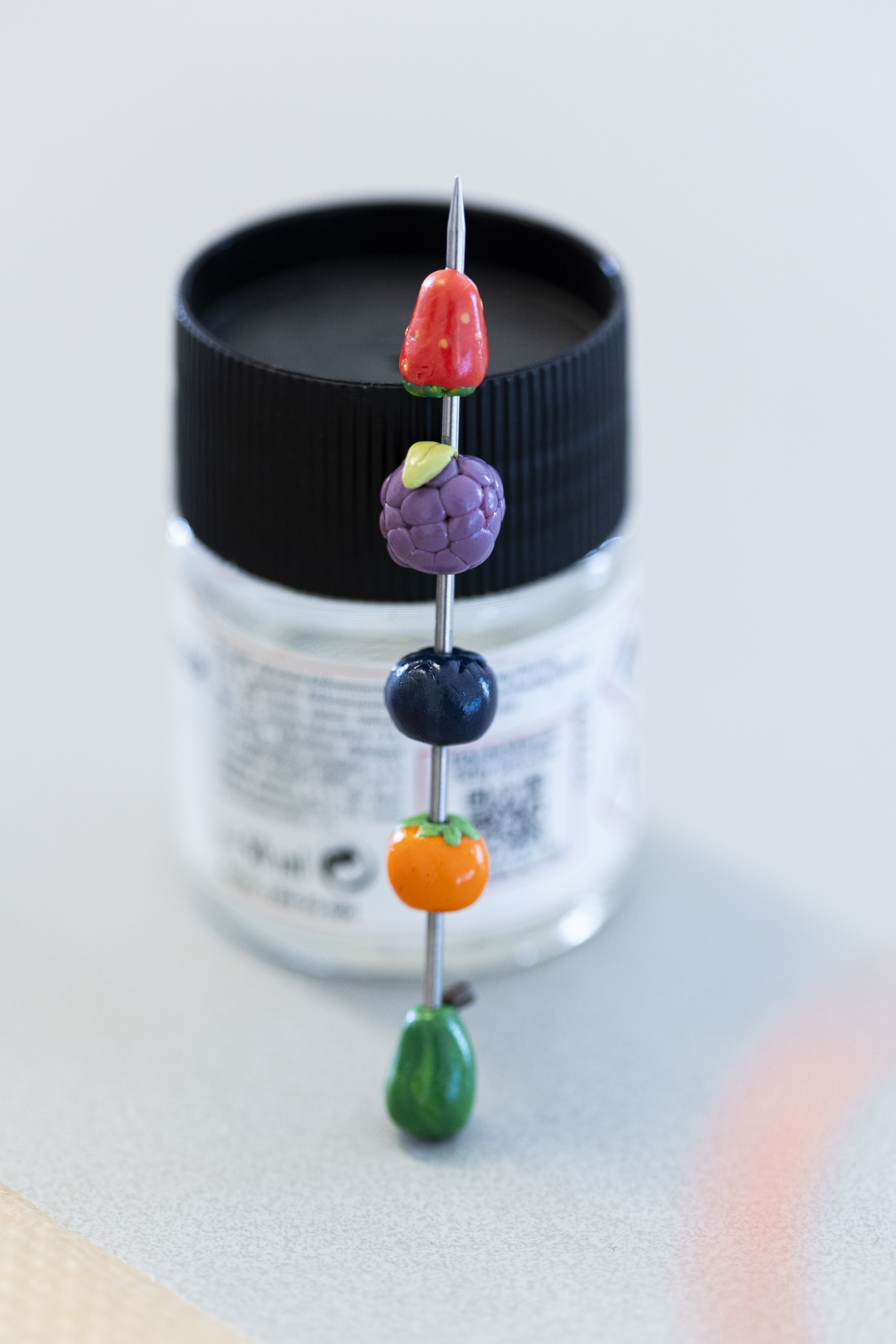 Maak een aantal bedeltjes in Fimo bv. in de afdelingskleuren telkens een stuk fruit (een lila druiventros, een gele banaan, een groene peer, een rode aardbei, een blauwe bes, een oranje mandarijn). Je kan daarnaast ook een Krinkelvuurtje maken door wat rode Fimo over gele Fimo te rollen en een vuurtje uit te snijden, je kan een Chiro kenteken maken in een afdelingskleur,.... kies wat bij je afdeling past. Zorg dat je overal gaatjes maakt op de juiste plaats.