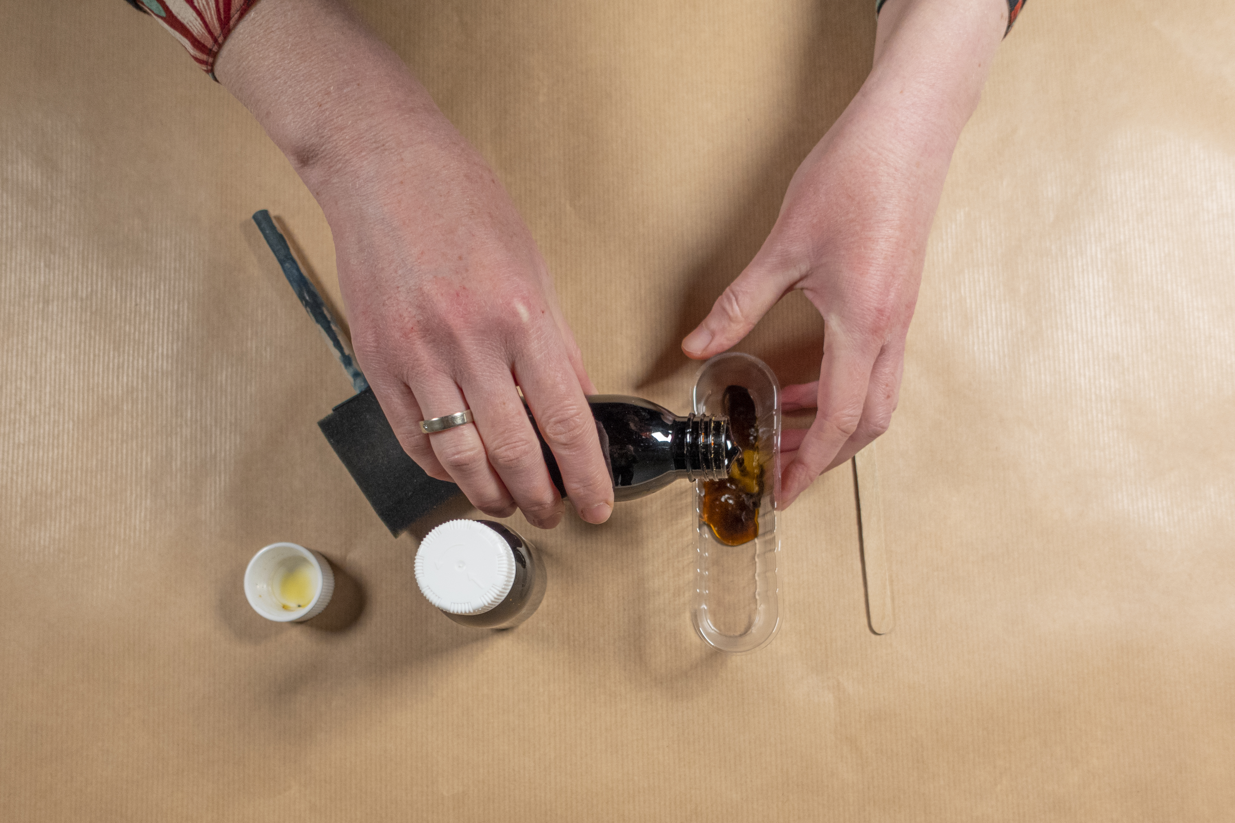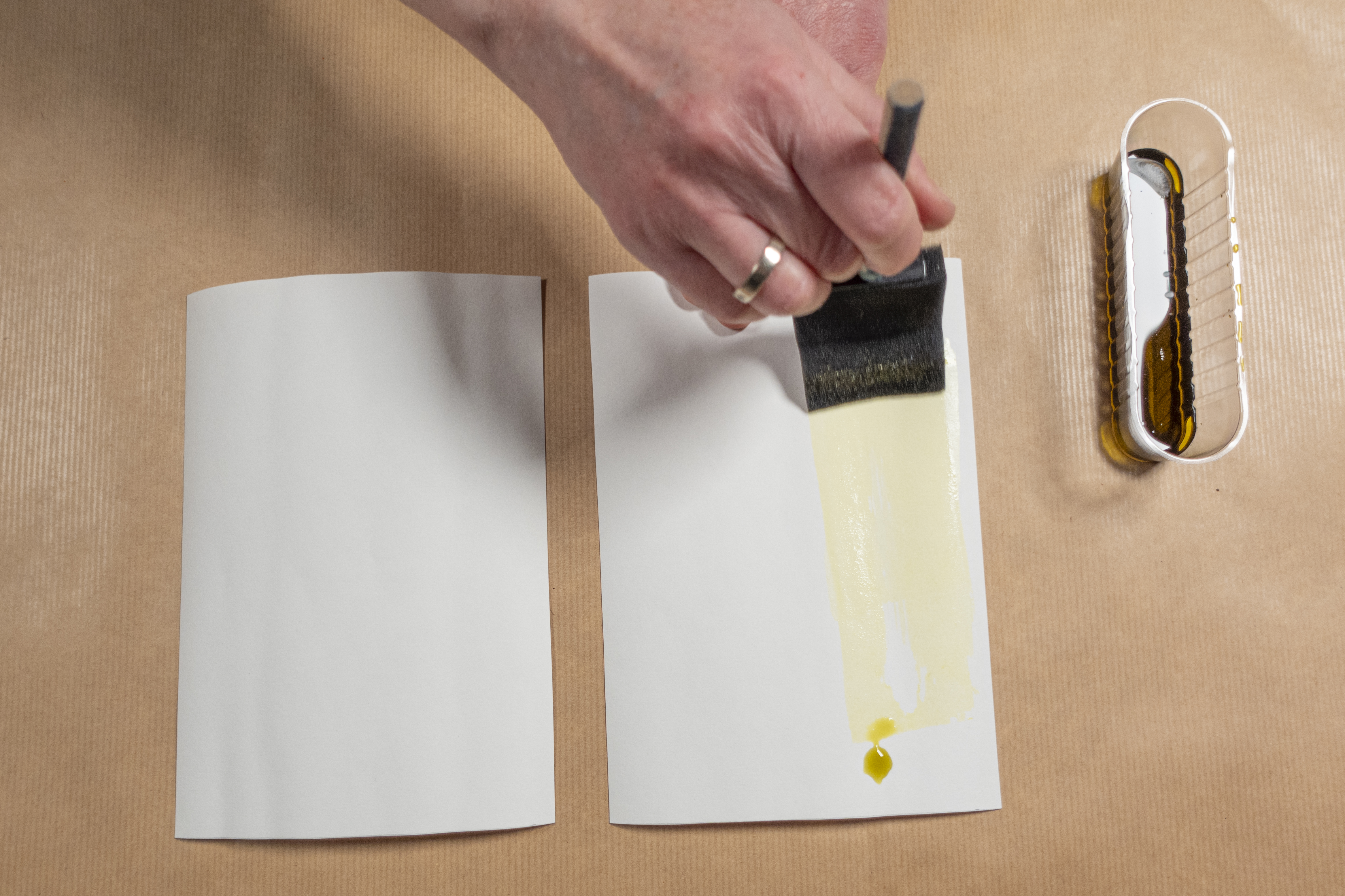 Breng met behulp van een schuimpenseel het lichtbruine mengsel aan op het Texipap-papier. Overal waar je het mengsel smeert, zal het straks blauw worden.