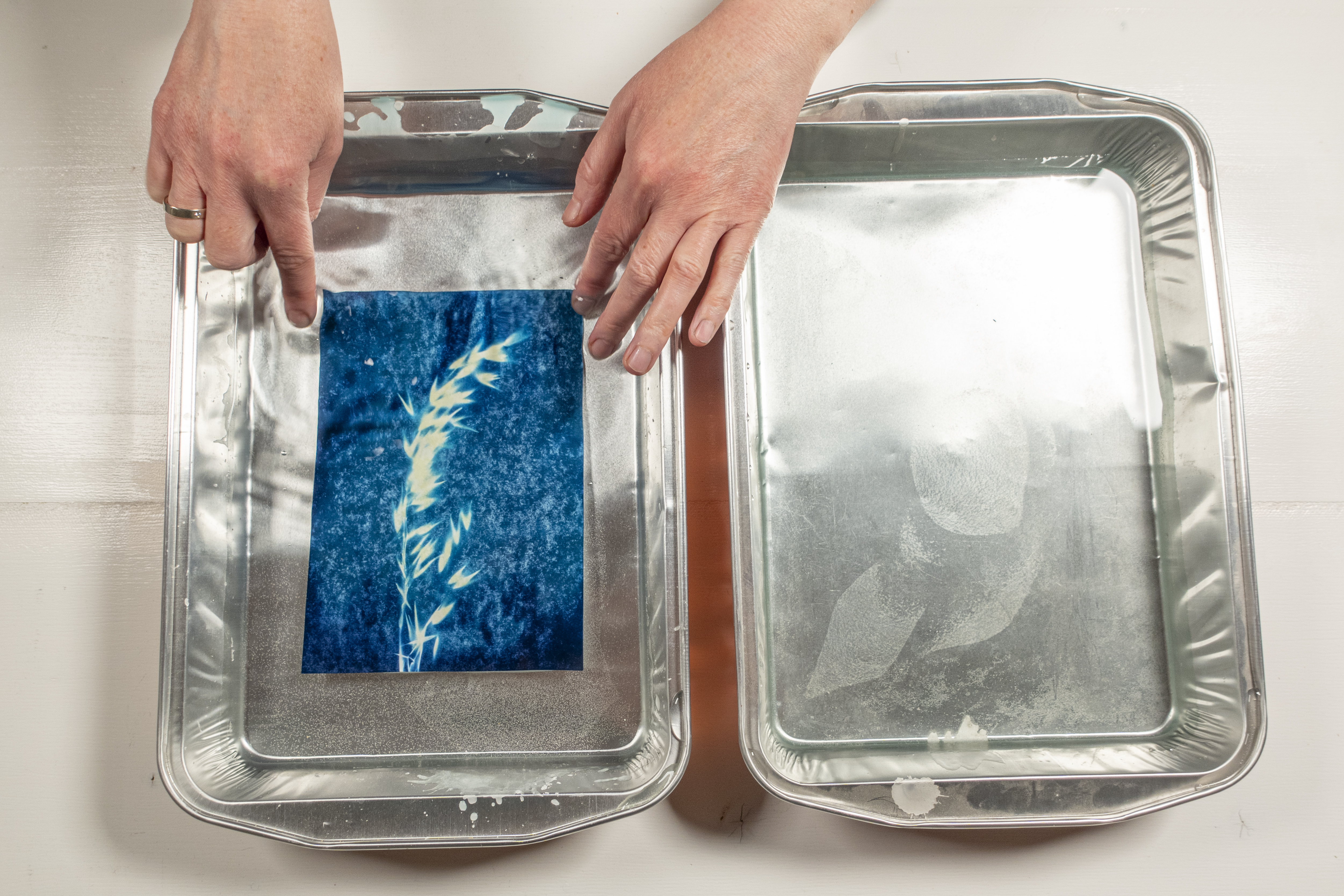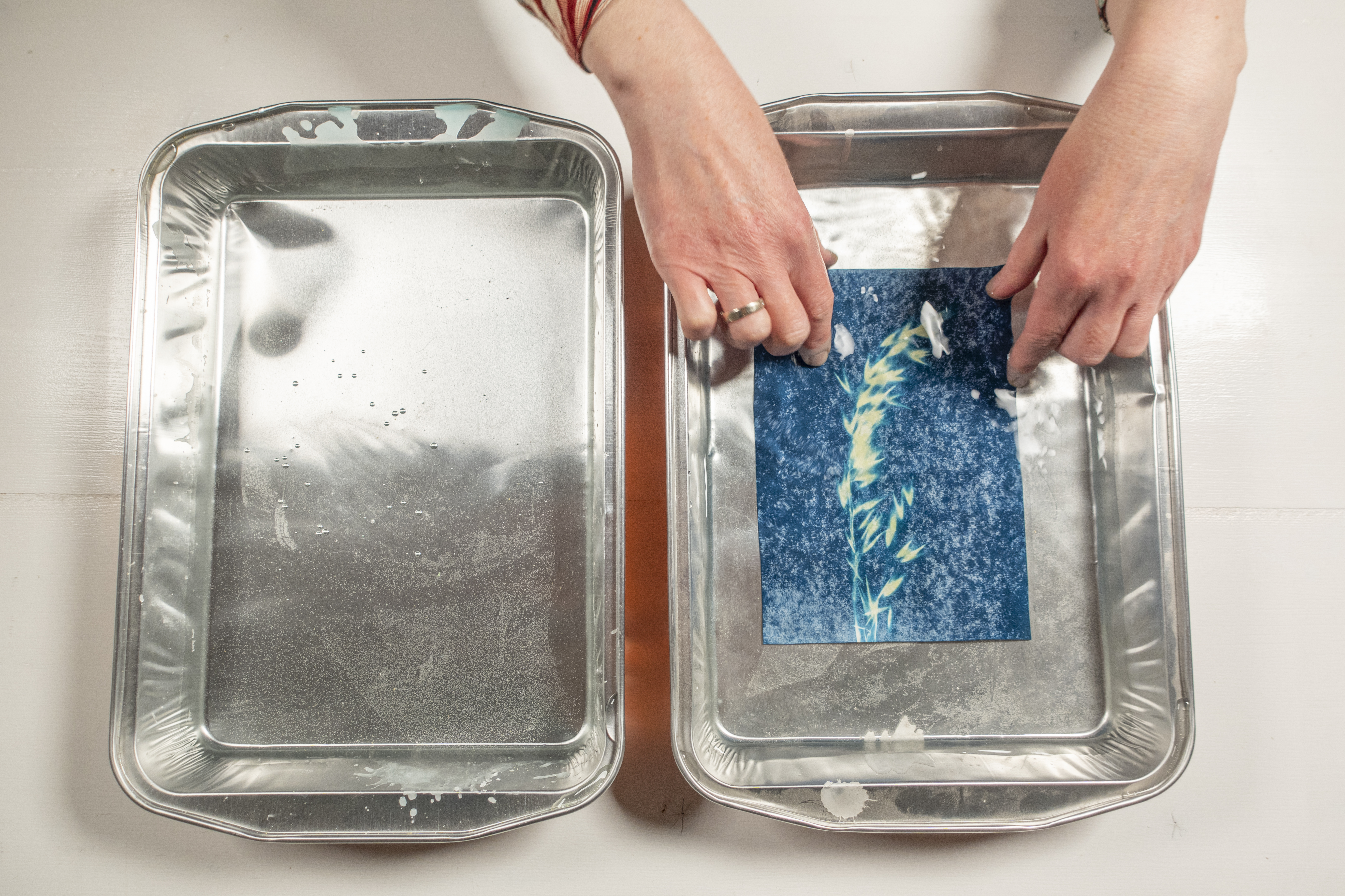 Maak een tweede badje aan en voeg enkele druppels waterstofperoxide toe. Spoel het papier een tweede keer uit, nu verschijnt de typische mooie donkerblauwe kleur.