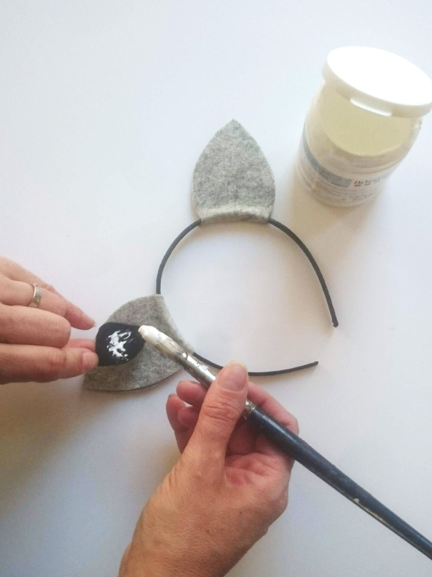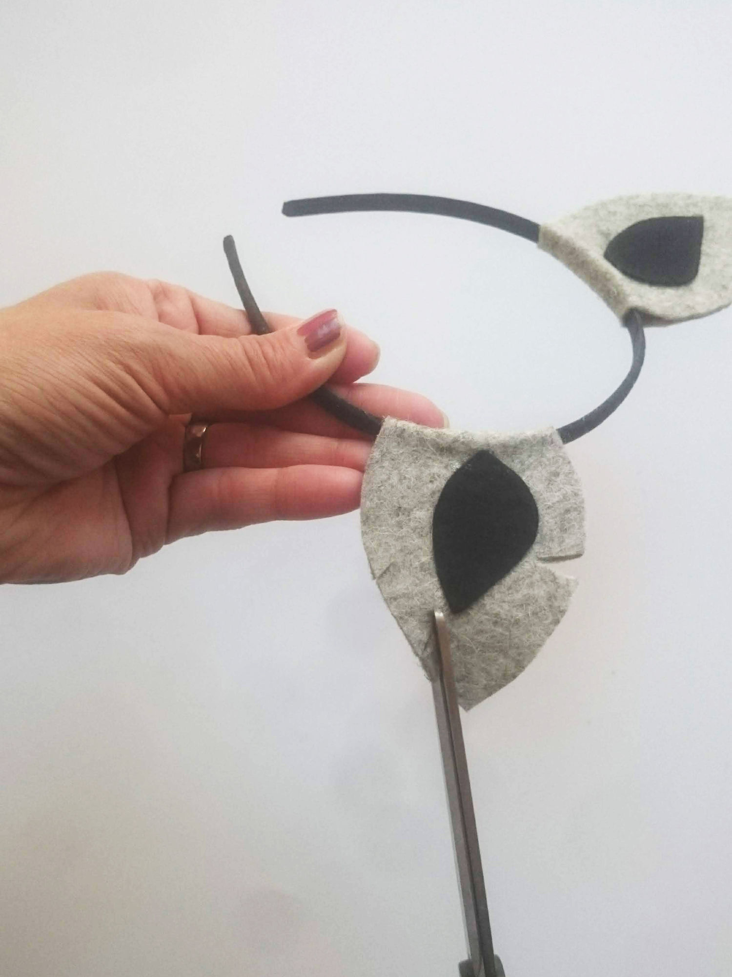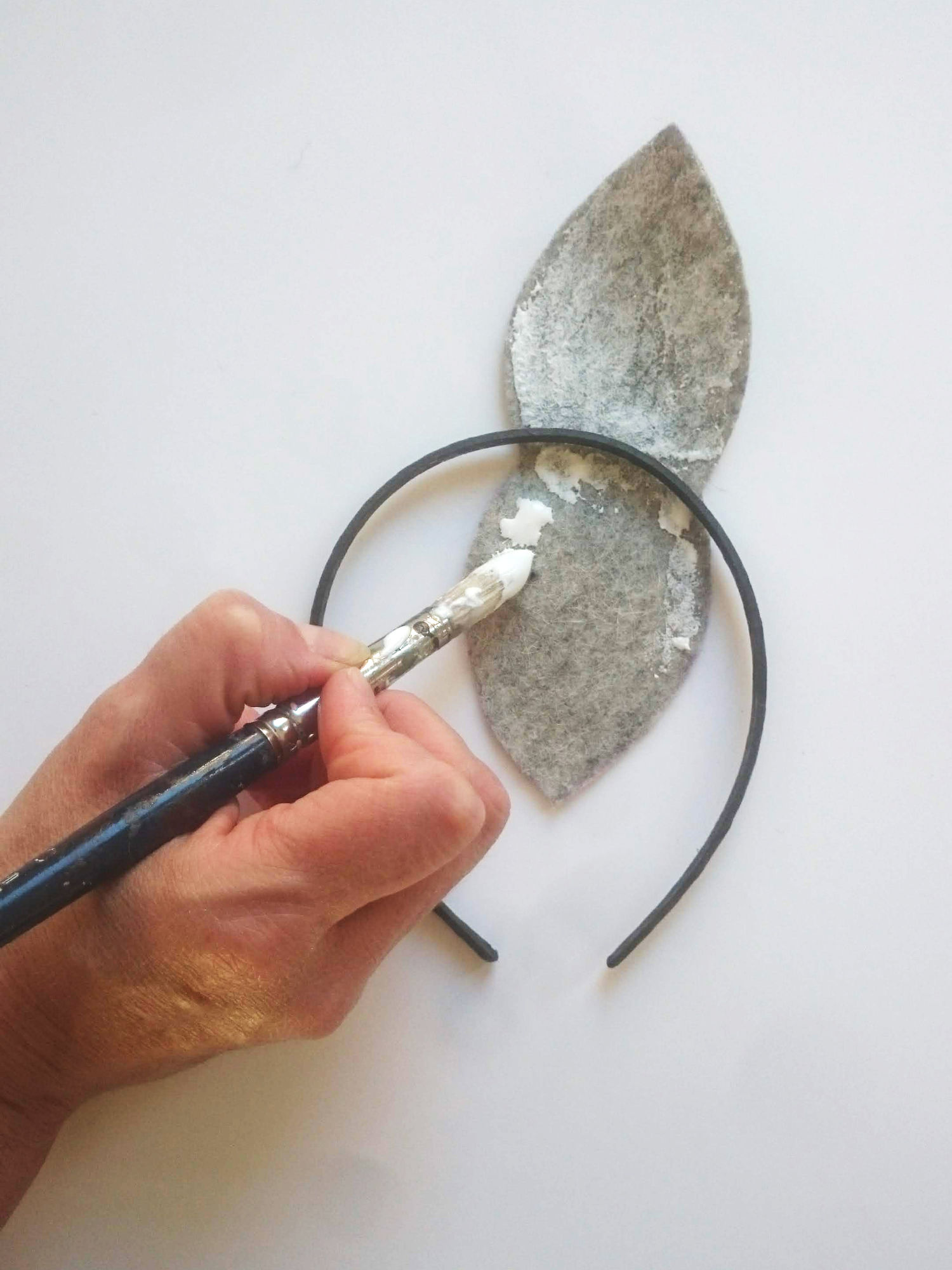 Smeer de grote grijze oren in met lijm en plooi dubbel om de diadeem.