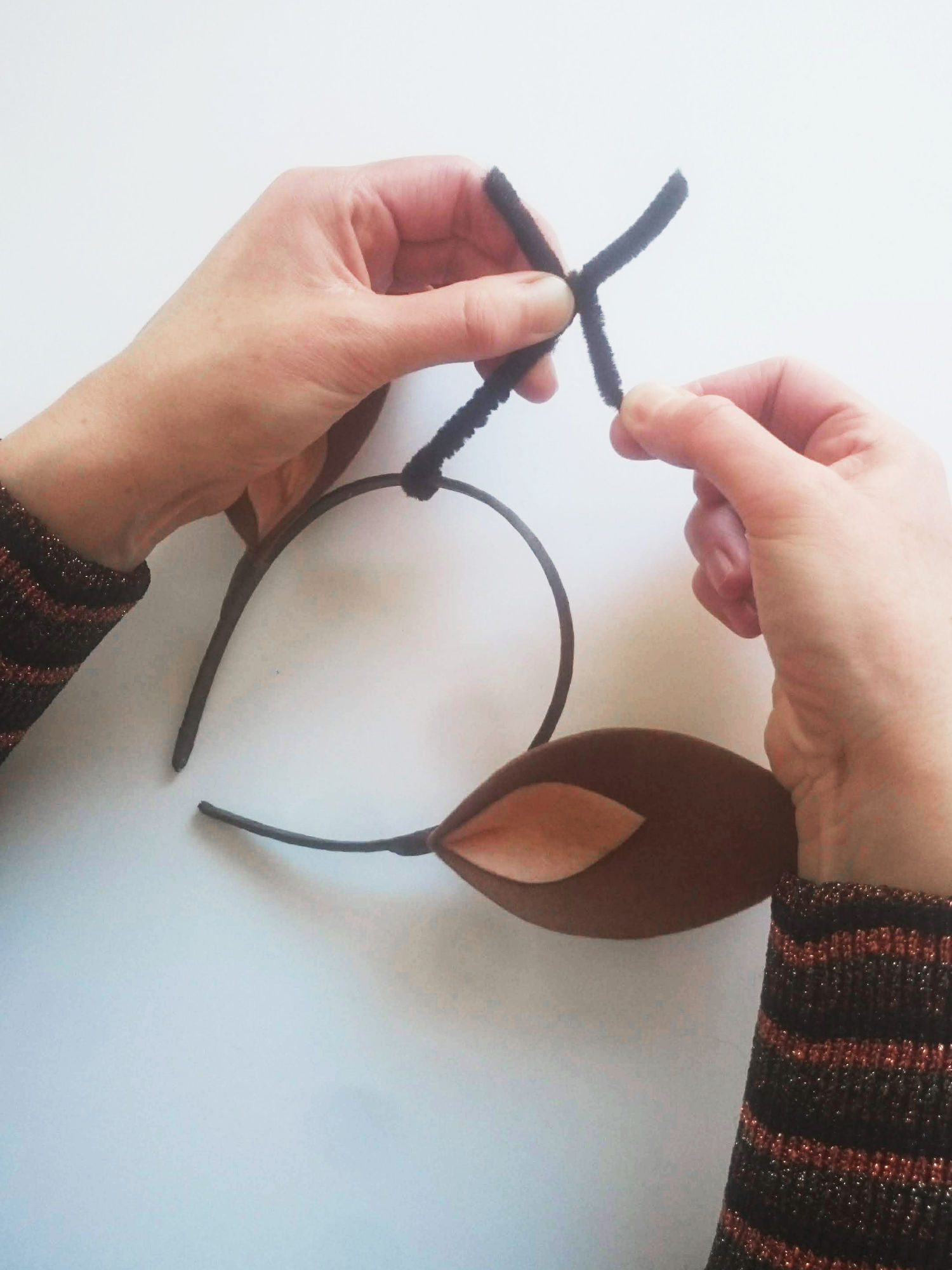 Knip ¼ van de chenilledraad. Plooi de langste draad dubbel om de diadeem en twist. Draai de korte draad twee keer om de eerste en zet het gewei in vorm.