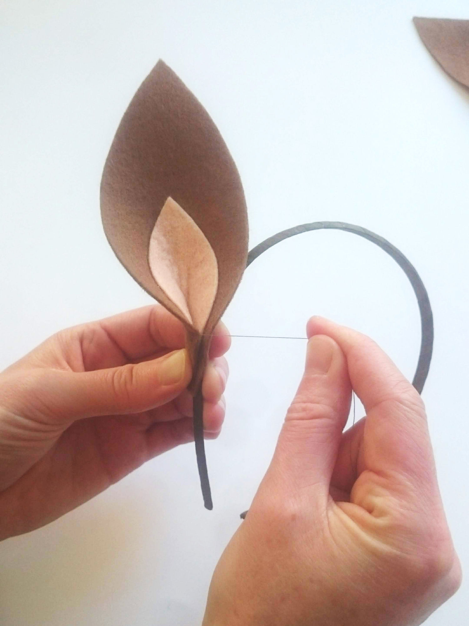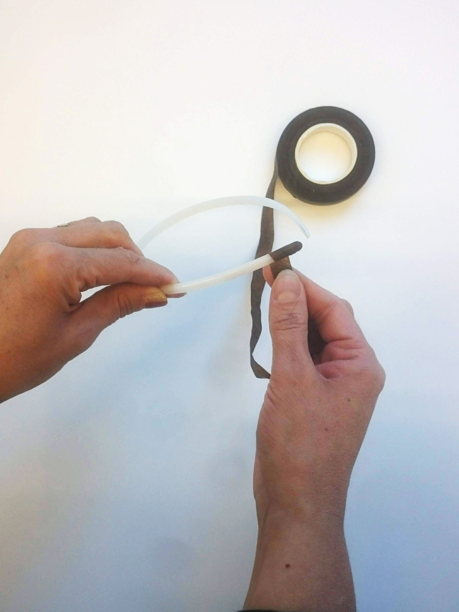 Naai de oren aan de diadeem en wikkel het uiteinde om met de bloementape.