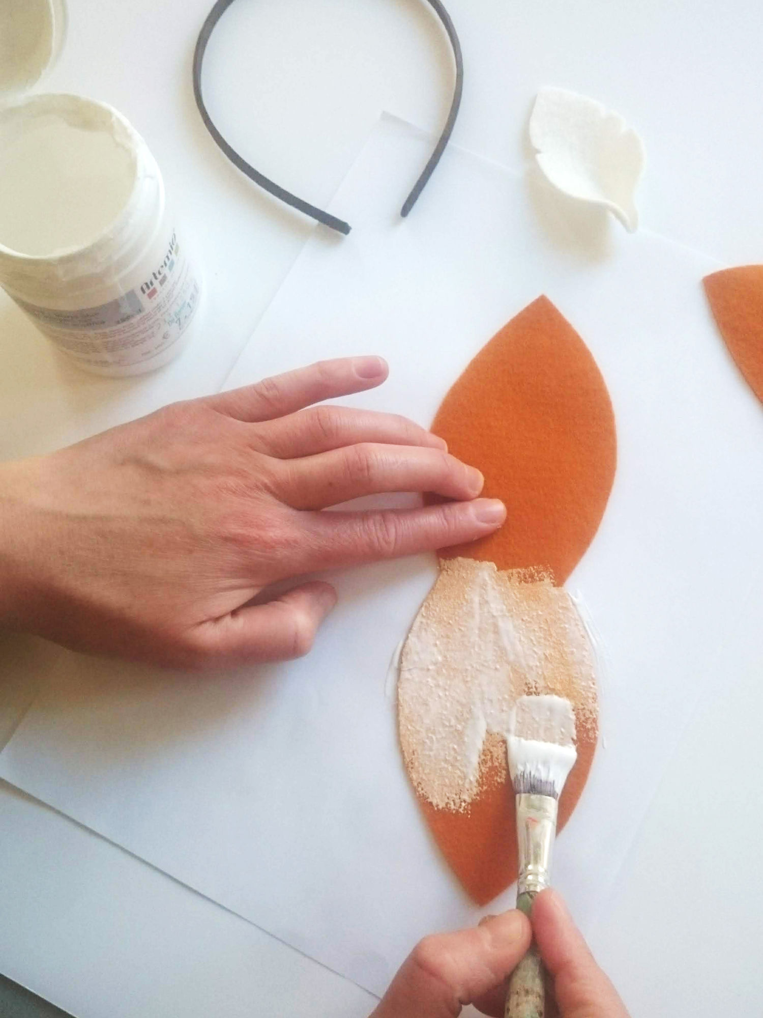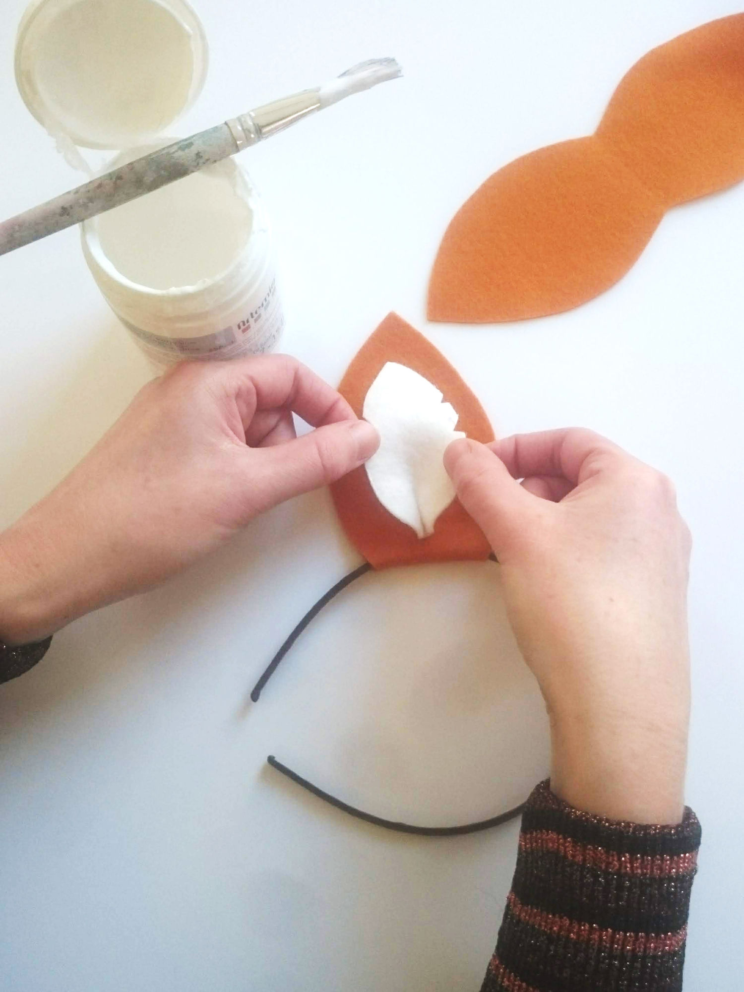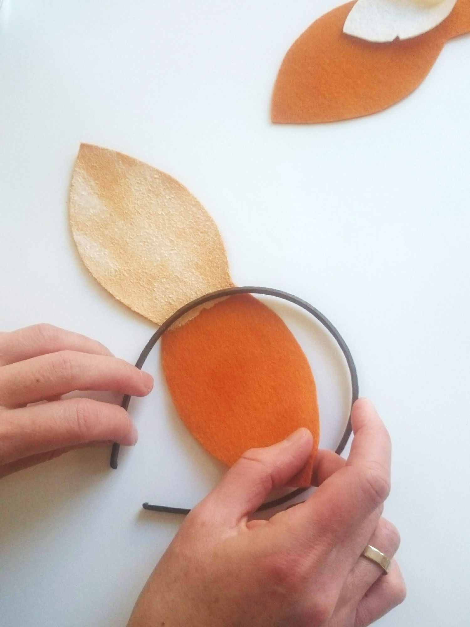 Smeer de grote oranje oren in met lijm en plooi dubbel om de diadeem.