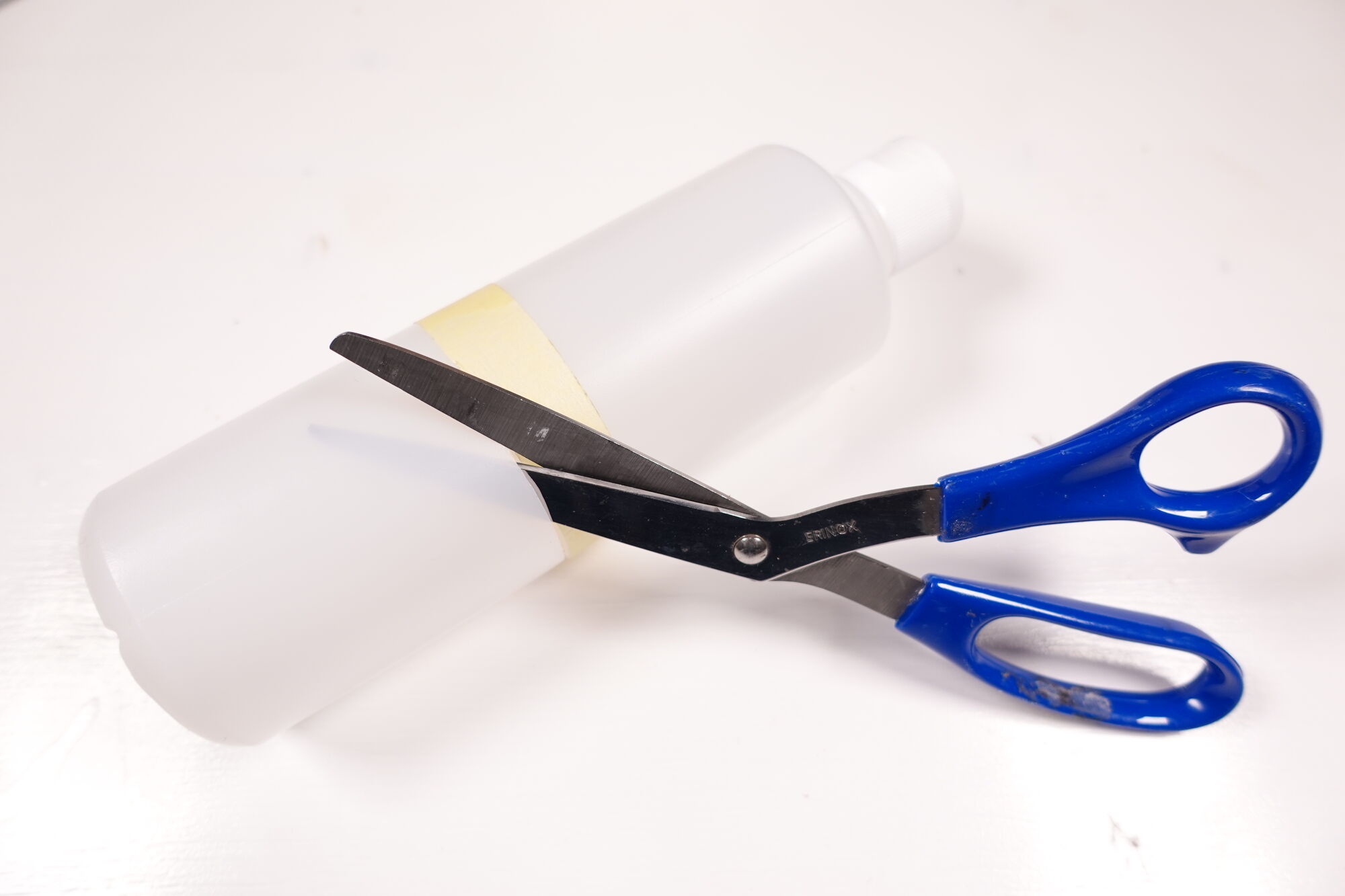 Neem het lege flesje, kleef op gewenste hoogte rondom papiertape. Let erop dat je mooi recht kleeft. Knip nu het flesje door met de papiertape als leidraad om recht te knippen.