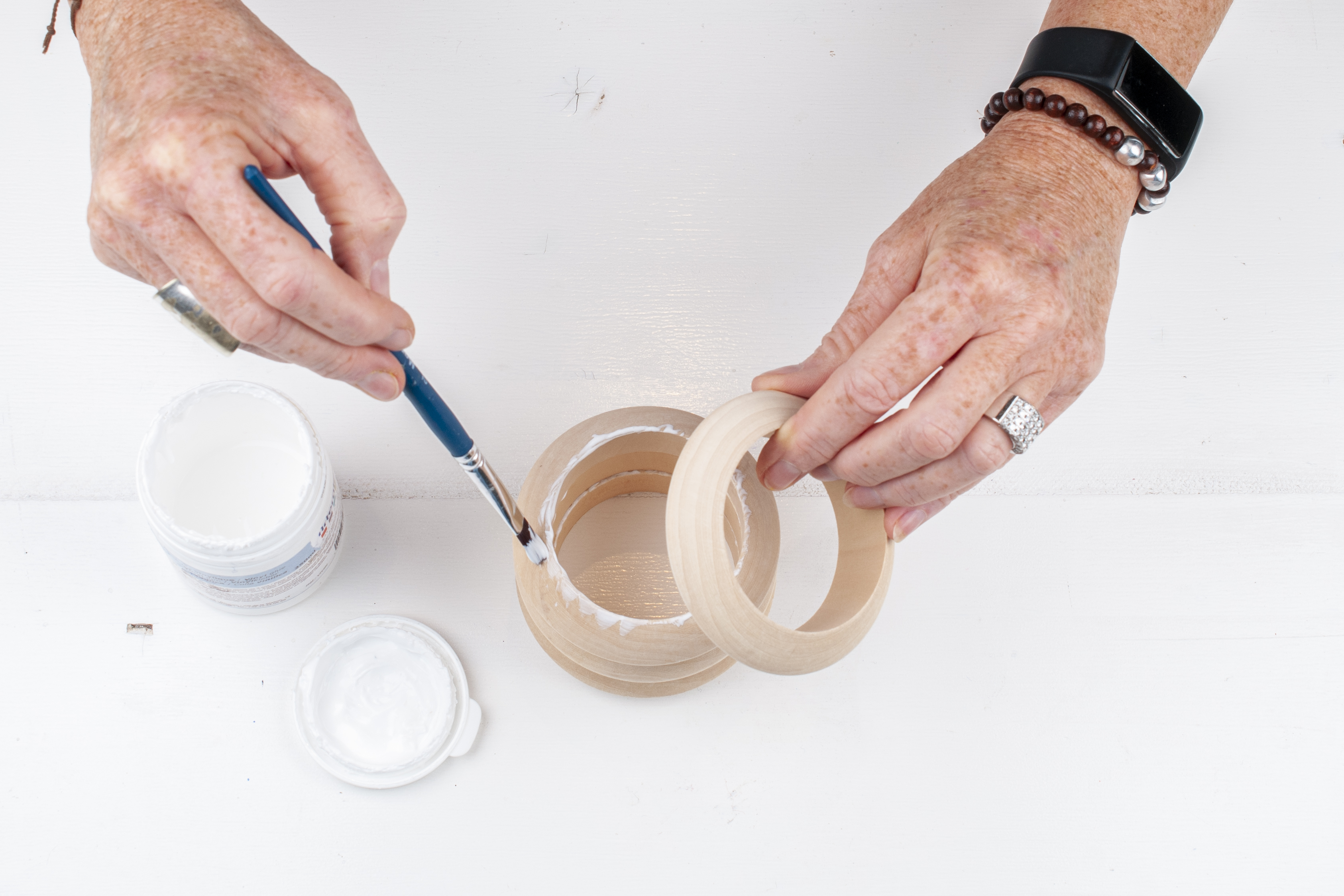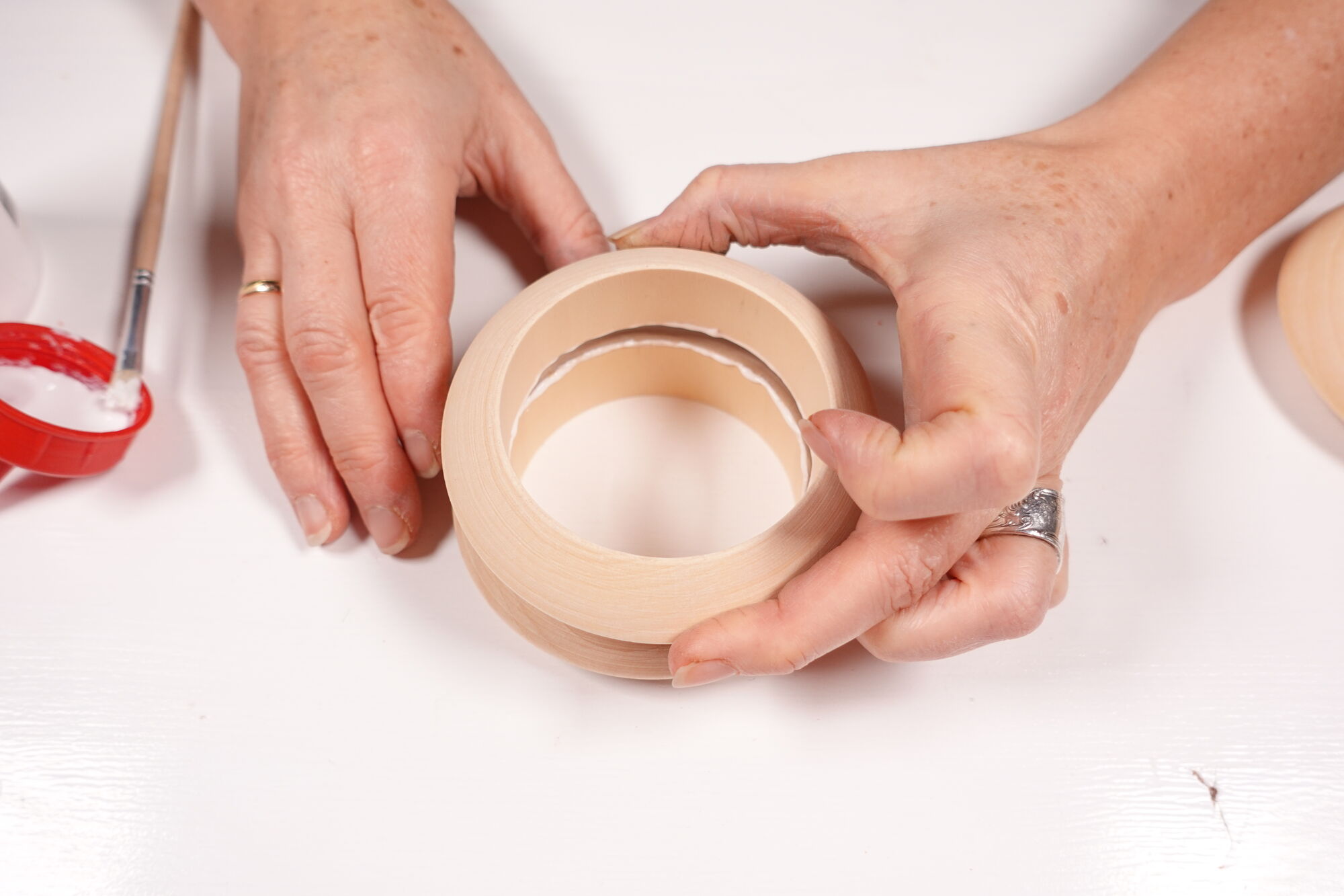 Breng op de bovenste rand van een houten armband een klein beetje lijm aan. Breng ook op de volgende armband lijm aan. Leg beide gelijmde kanten rustig op elkaar en druk goed aan. Herhaal deze stap met de volgende armband.