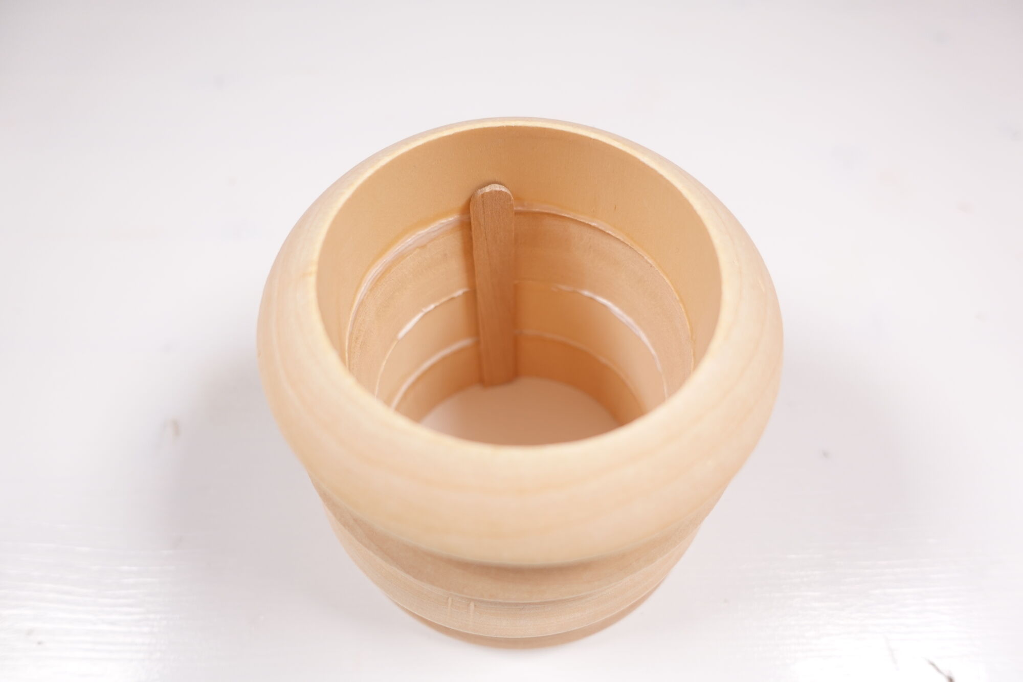 Steek het flesje in de houten vaas, zo kan je ook bloemen of plantjes in het vaasje plaatsen. En water geven!