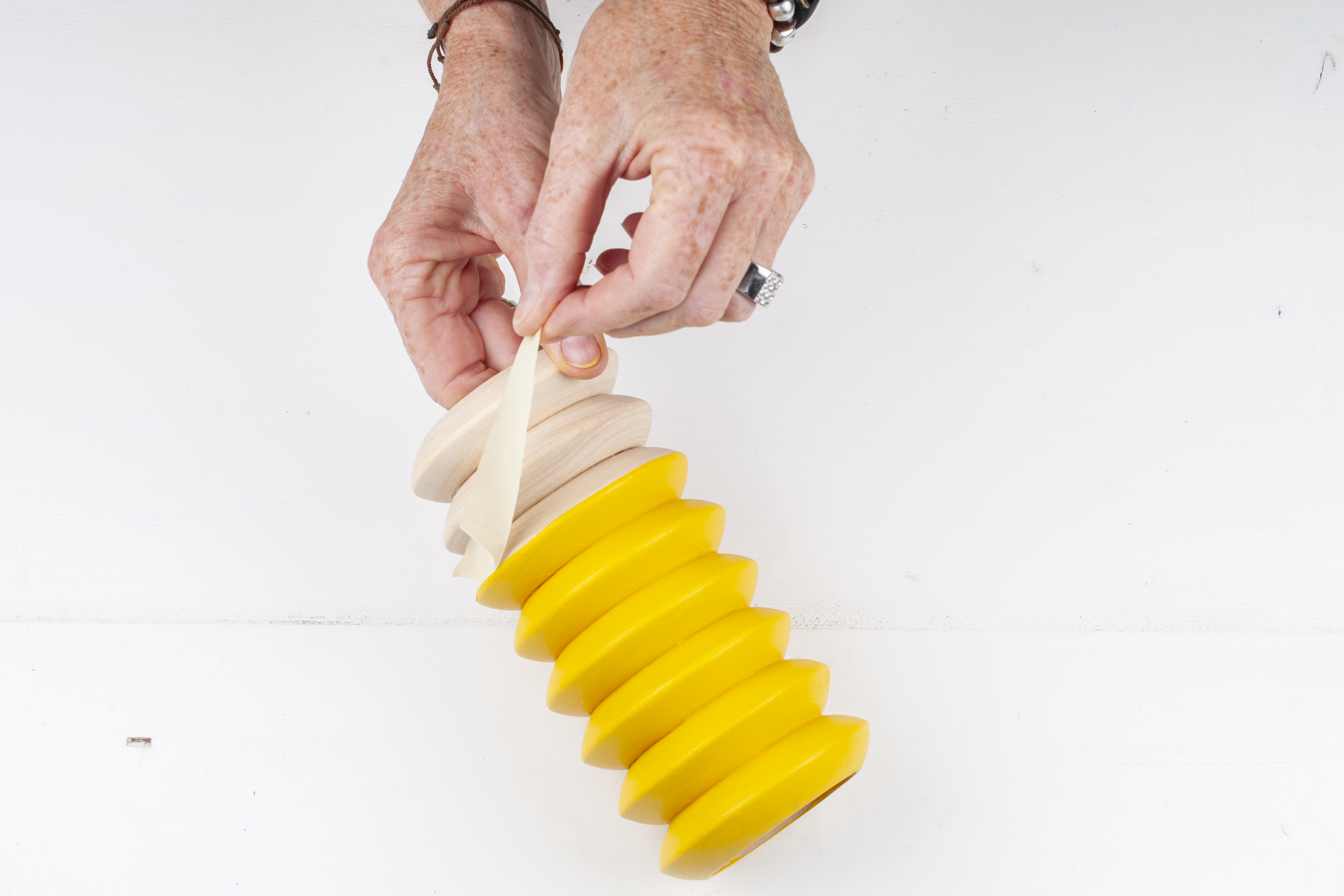 Voor een vaasje van 8 armbanden hoog, werkt het best om 2x een stapel van 4 armbanden te maken. Laat beide stapels drogen en lijm vervolgens op elkaar.