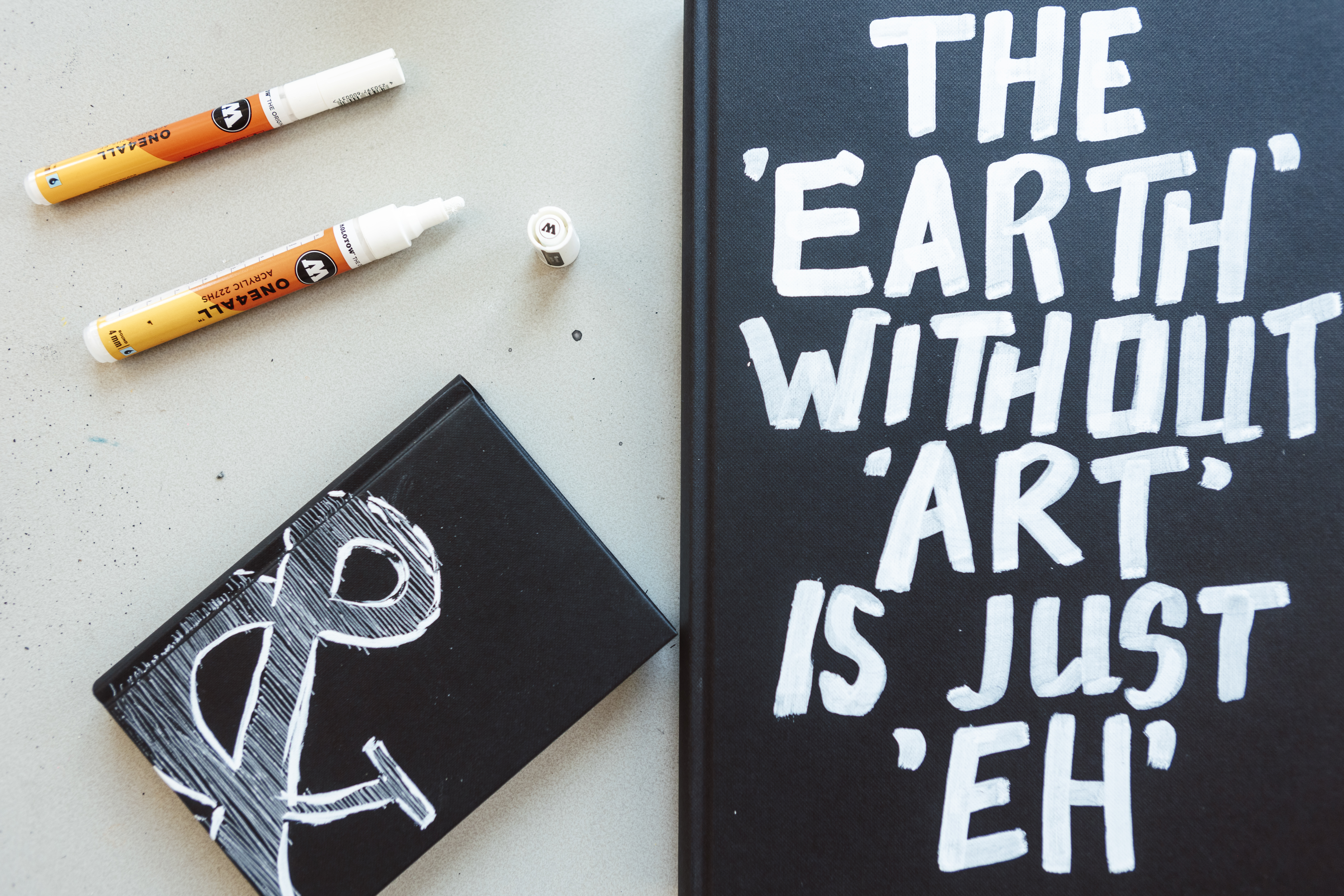 Schrijf je favoriete quote op een zwarte schetsboek met witte Molotow markers of Tipp-ex correctievloeistof.