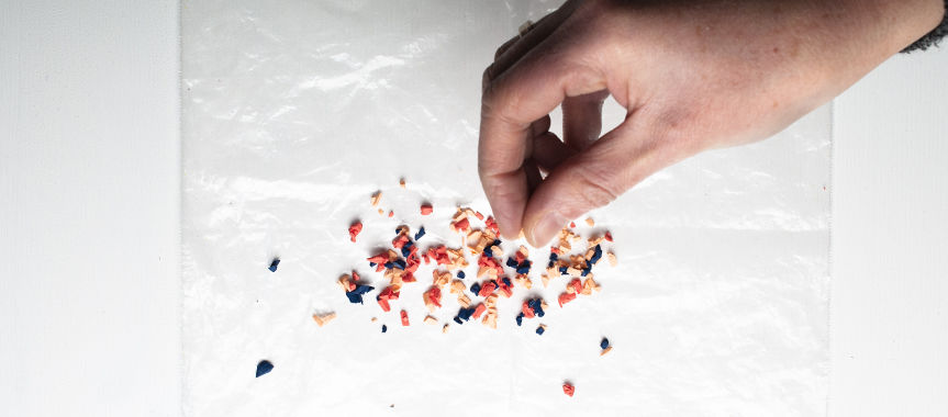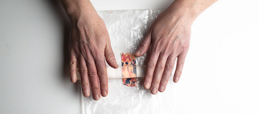 Neem huishoudfolie of een plastic zakje. Verdeel verschillende kleurtjes over de huishoudfolie. Langs één kant leggen we een effen stuk van de flamingoroze kleur. Plooi de folie dubbel.