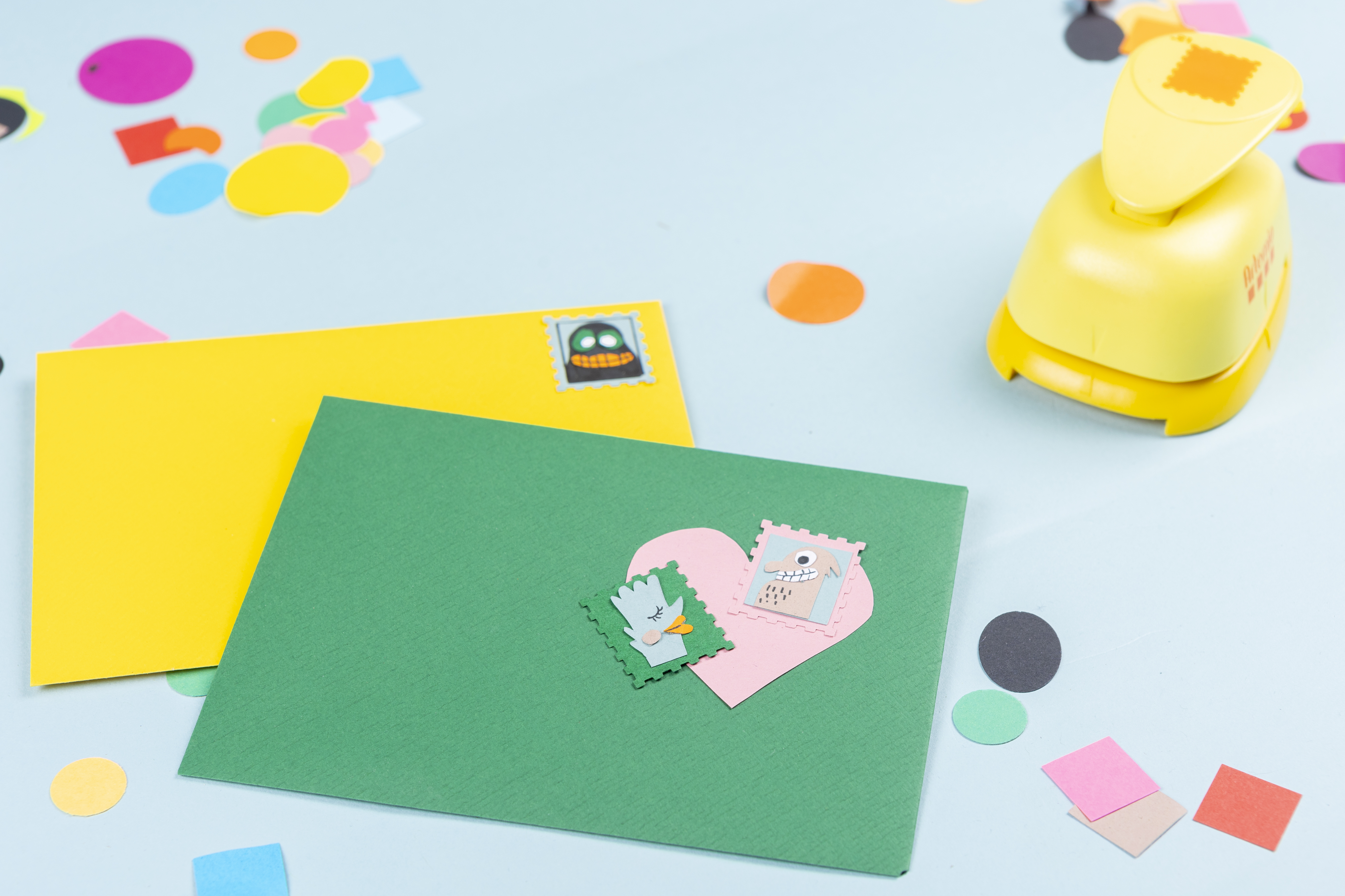 Pons naar hartenlust uit gekleurd papier of knip een figuurtje uit bv een postzegel. kleef de uitgeponste harten op een wenskaart of omslag.