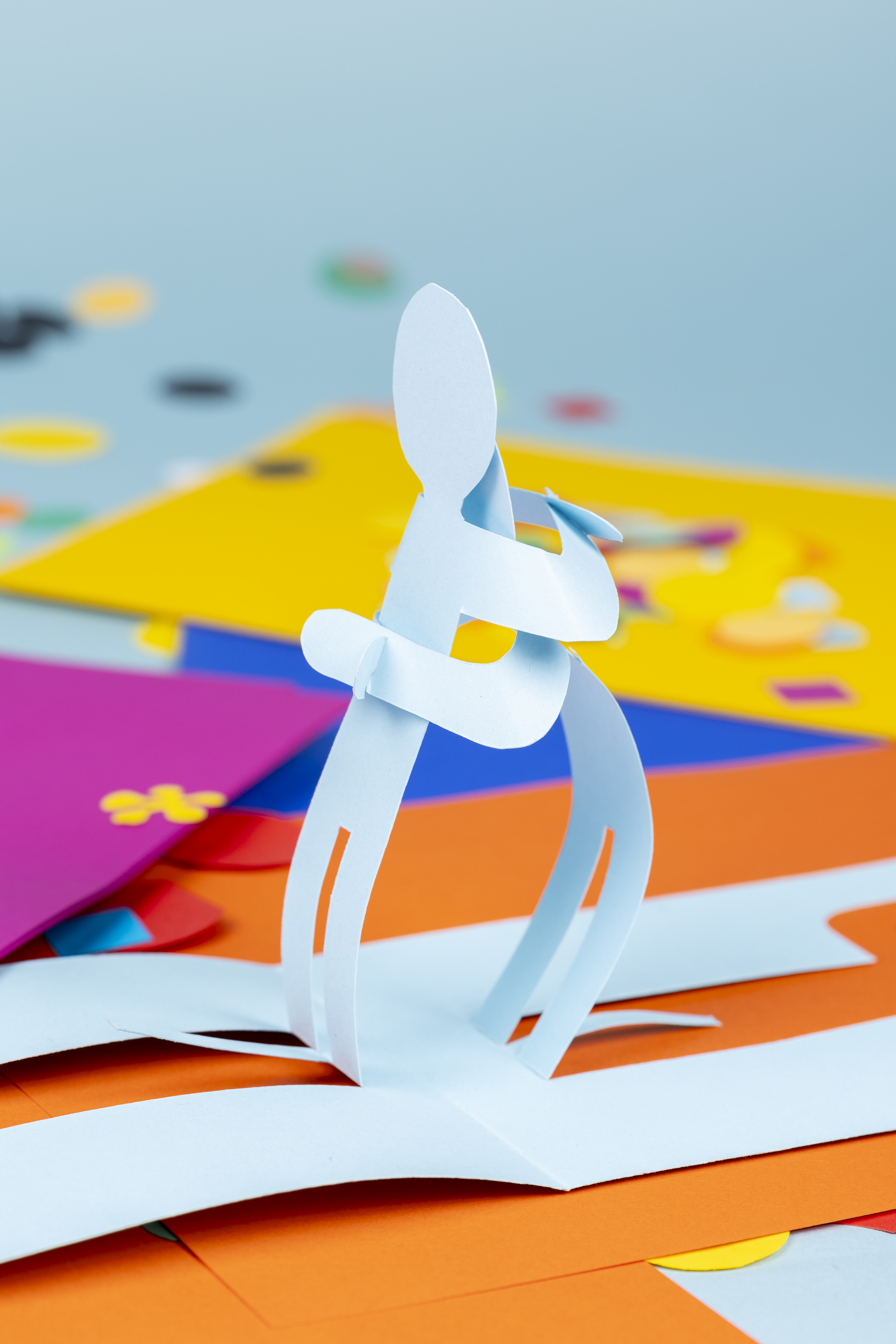Snij uit een gevouwen kaart aan twee kanten een figuurtje uit. Zorg dat ze in het midden niet doorgesneden worden. Vouw ze omhoog aan de benen en laat ze elkaar omhelzen.