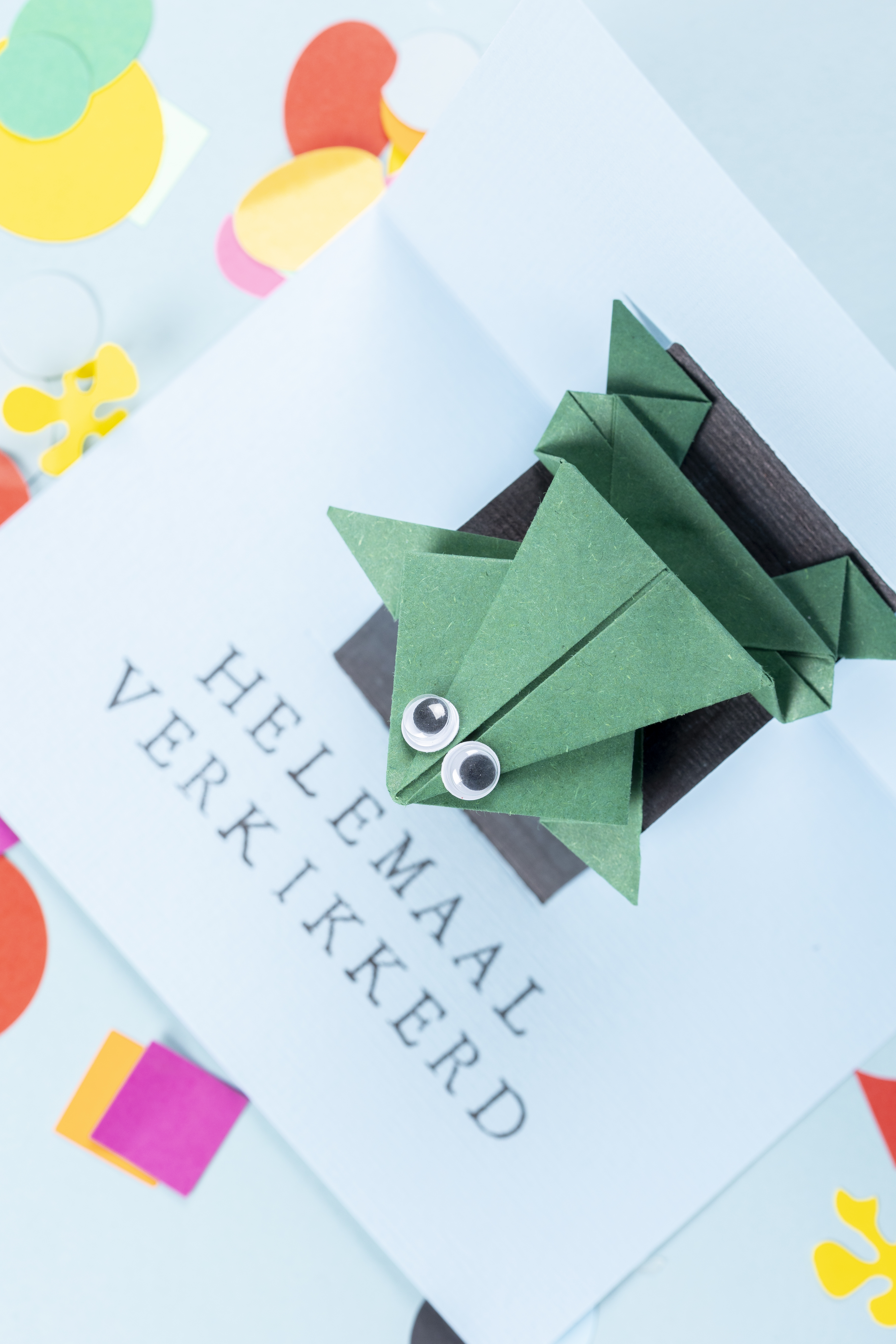 Vouw een origami kikker. Kleef er wiebeloogjes op en kleef de kikker op een gekleurde kaart.