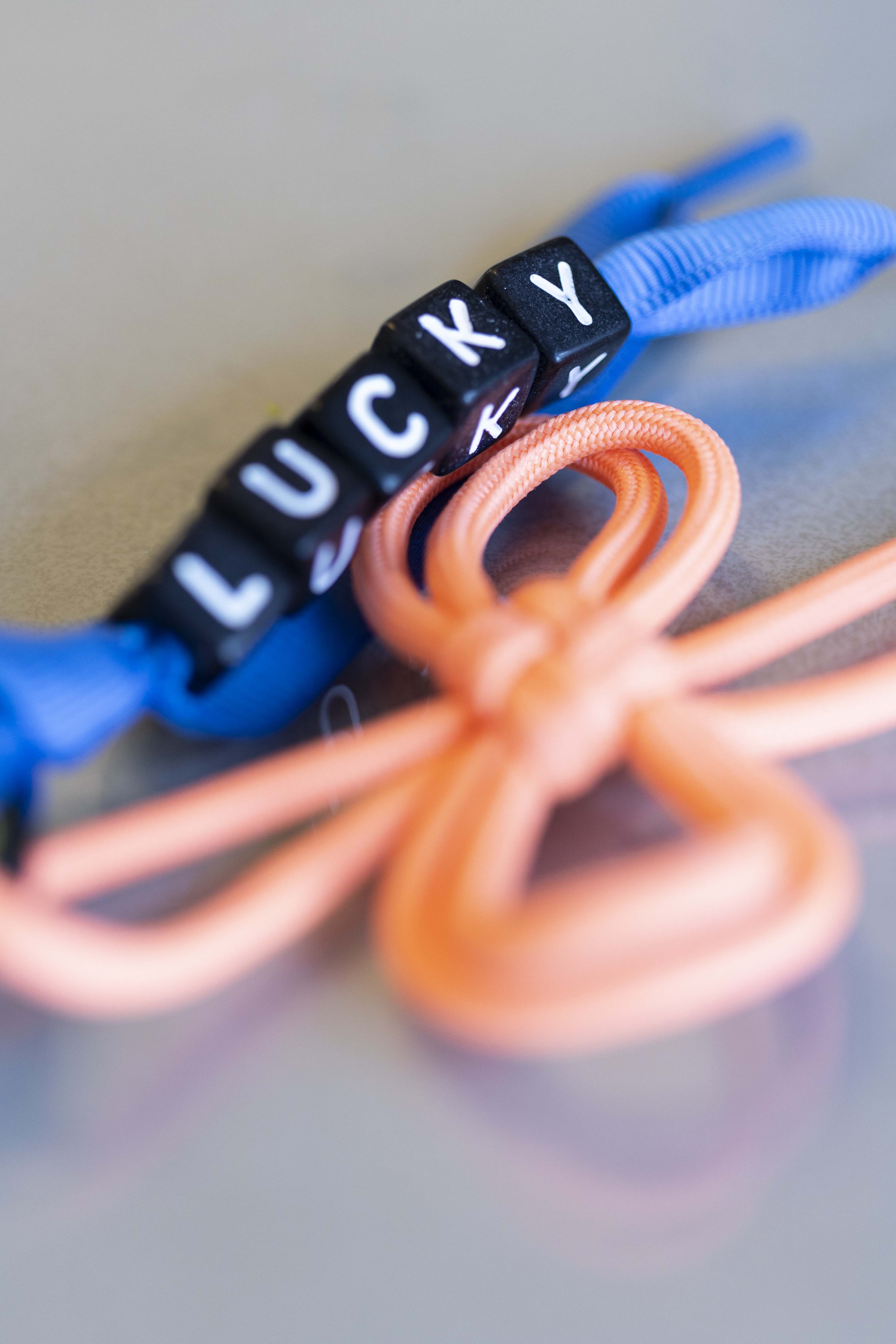 Maak enkele bedeltjes in Fimo bv een bloempje in beach gras, een strikje in grapefruit pink, een worm in grapefruit pink, een appel in indisch rood, een hapje uit de appel in wit, een klokhuis, oogje of ander detail in zwart,.... je kan een prismastift in het strikje en/of bloempje bovenaan steken en mee afbakken. Zorg dat de worm rond de veter past, dus maak de worm meteen rond een stokje zodat je die kan rijgen als een kraal rond de veter.