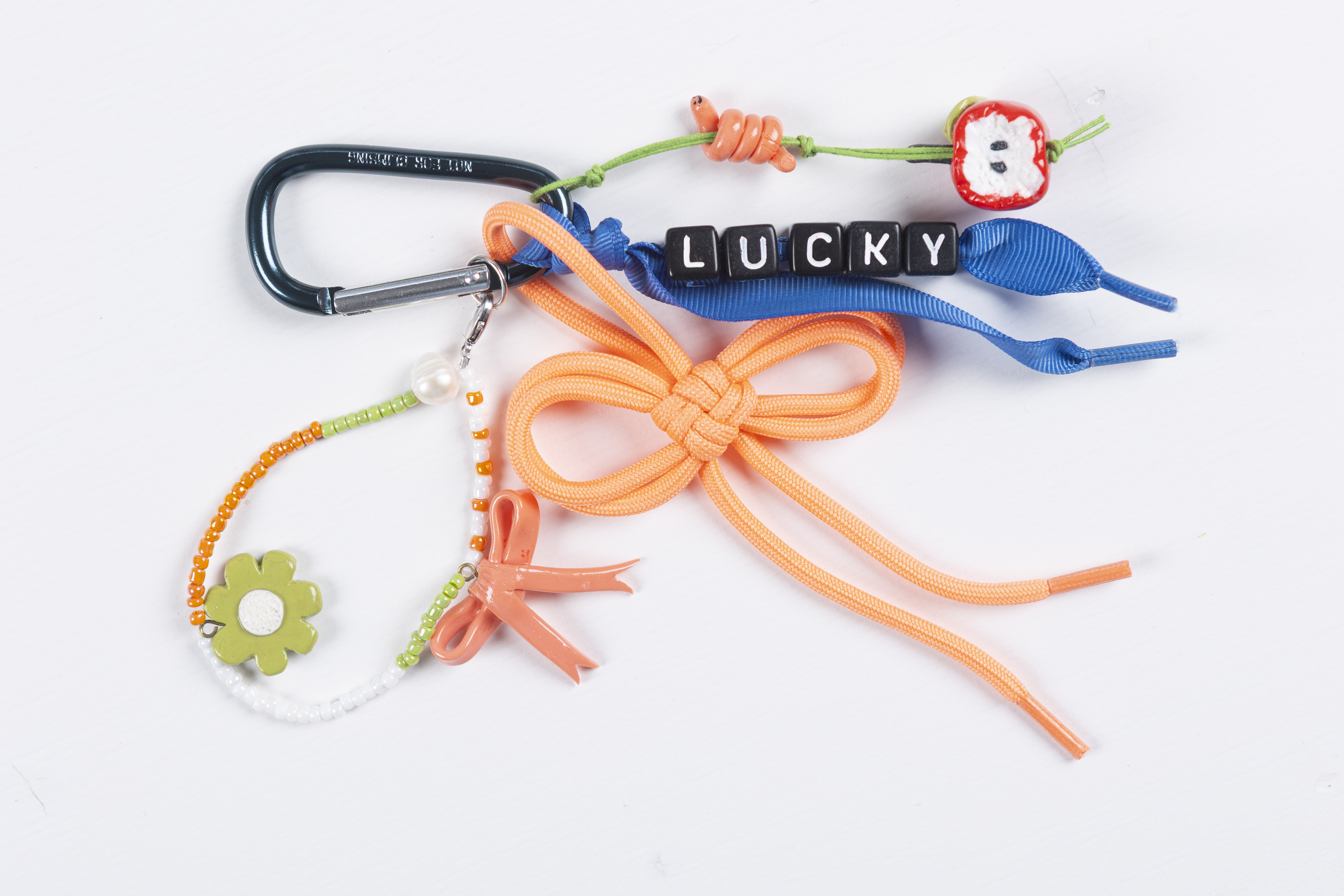 Rijg een eindje kralen en rijg ertussen het Fimo bloempje en het fimo strikje. Met een knijpkraal bevestig je dit aan een oogje en een menoslotje. Hang alle gemaakte stukken nu aan de karabijnhaak.