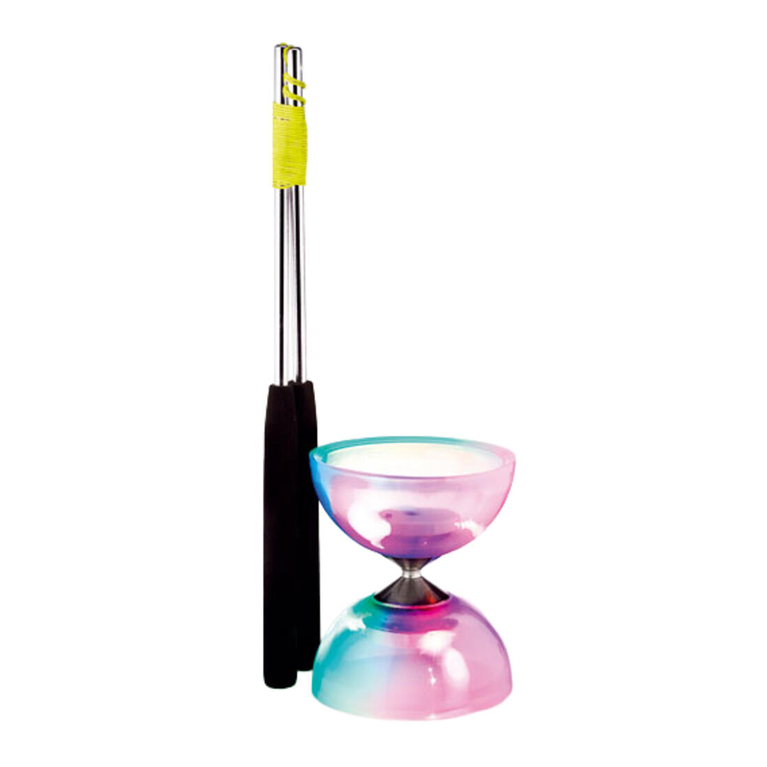 Diabolo set van het Belgische merk Acrobat. De set bestaat uit aluminium handstokken en een transparante diabolo van 12 cm hoog, diameter 10,5 cm.