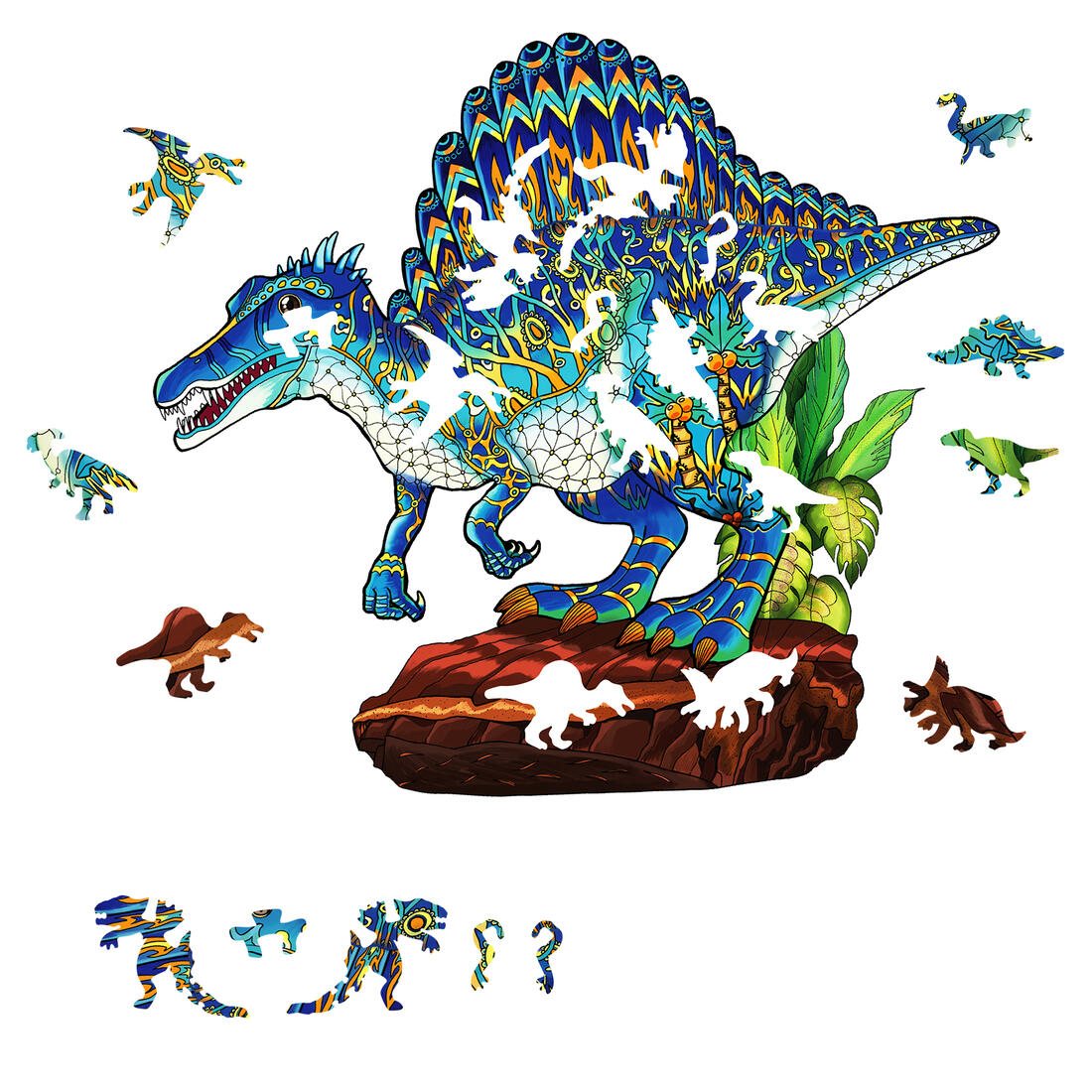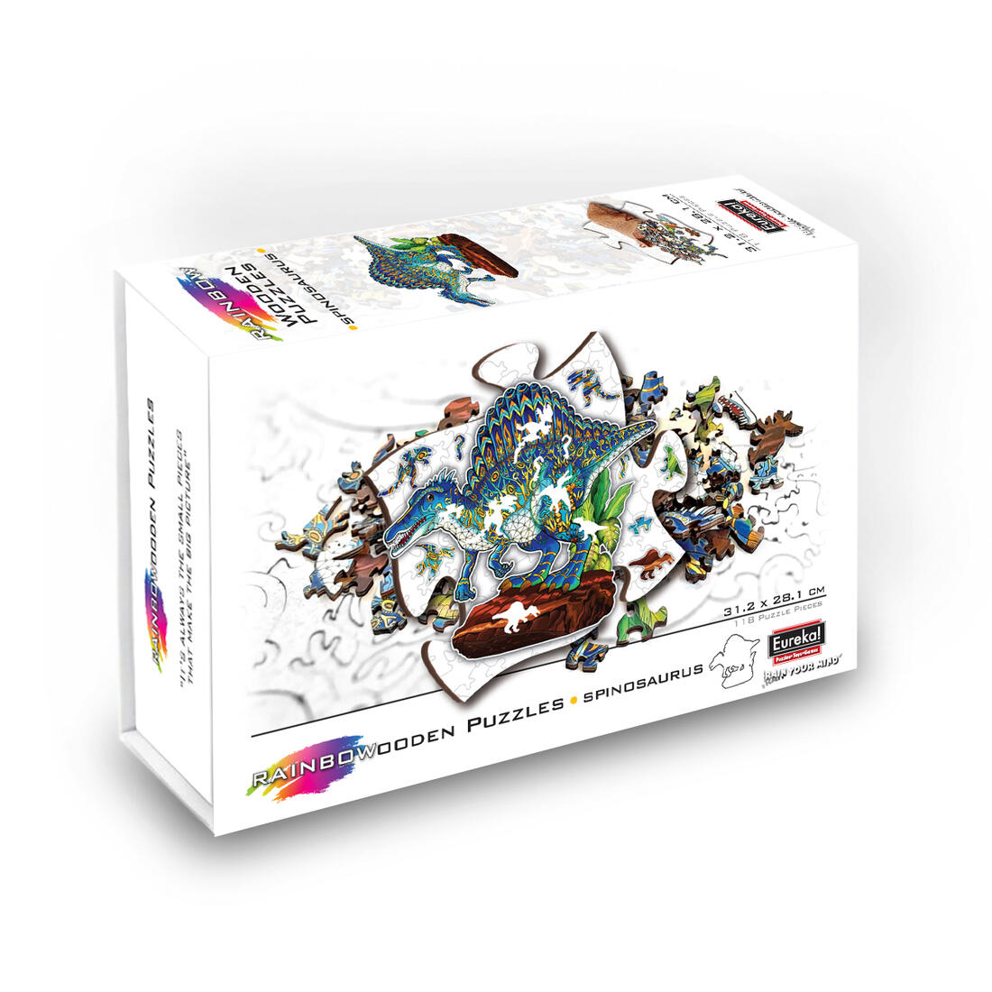 De volledige puzzel is een Spinosaurus van 312 op 281 cm en bevat 118 stukjes.
