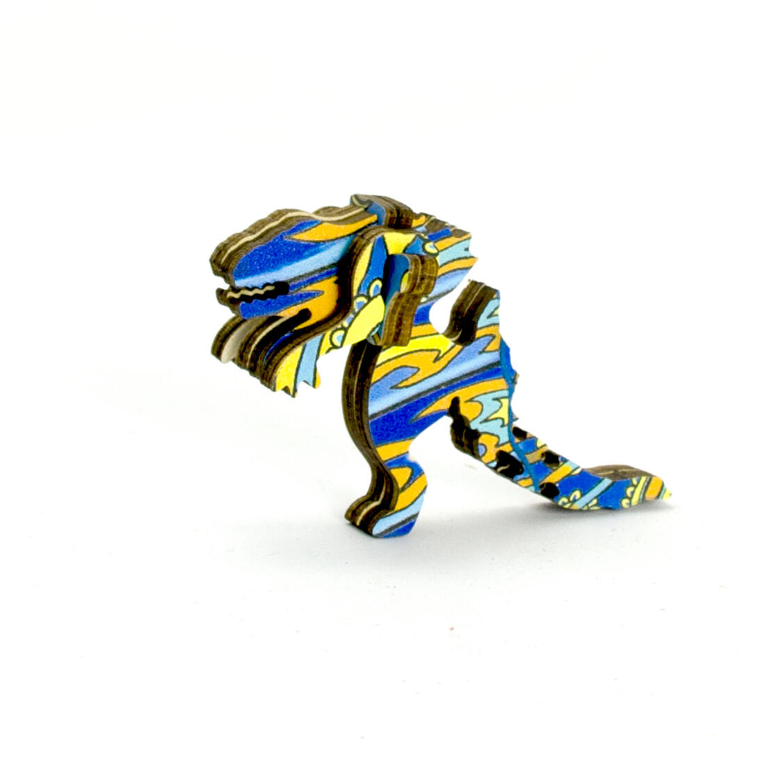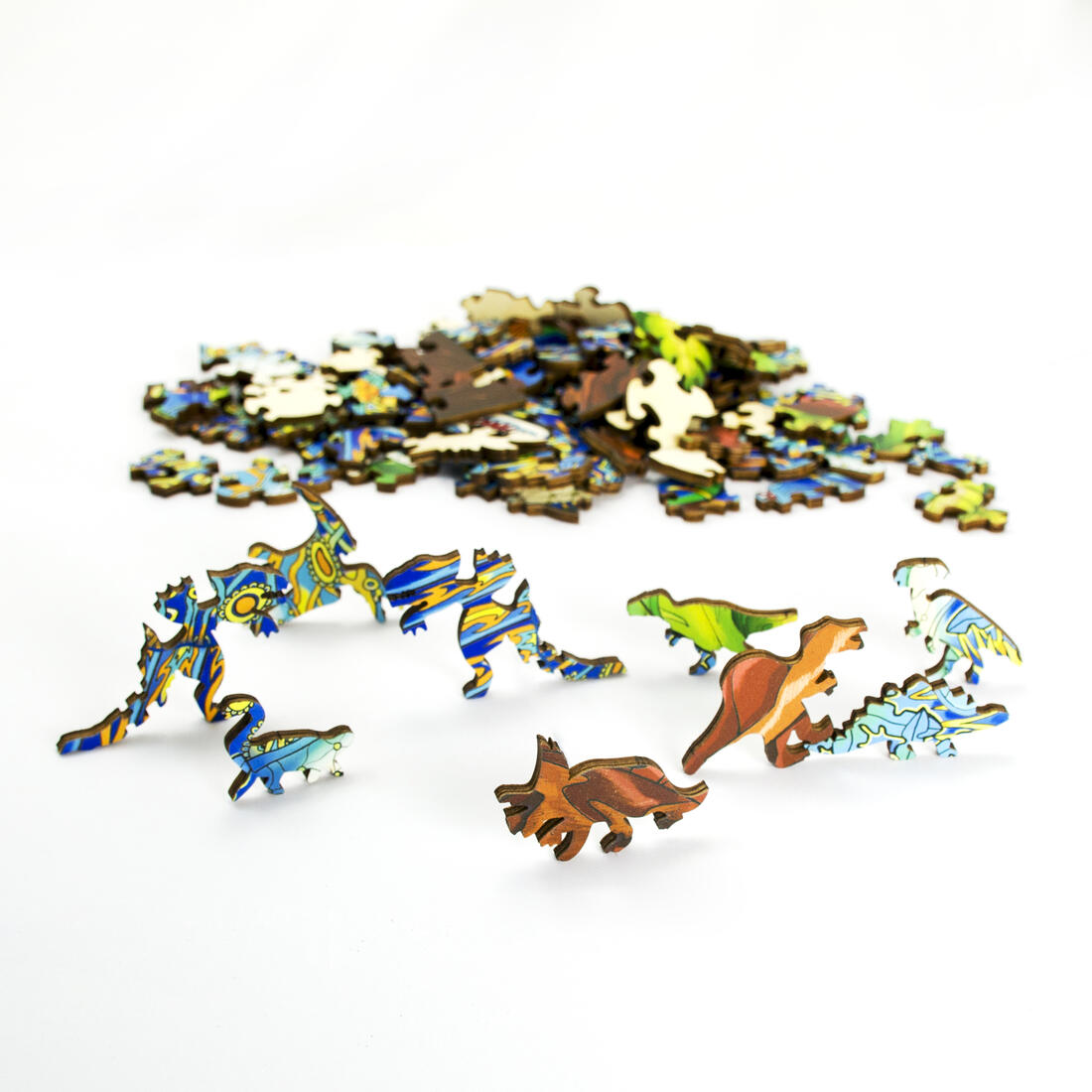 Prachtige, kleurrijke houten puzzel. De puzzel bestaat uit originele, mooi uitgezaagde stukjes, waarvan verschillende in de vorm van een dinosaurus.