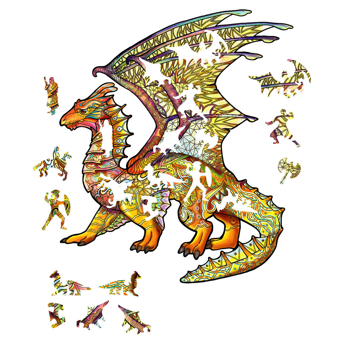 Prachtige, kleurrijke houten puzzel. De puzzel bestaat uit originele, mooi uitgezaagde stukjes, waarvan verschillende in de vorm van een draak.