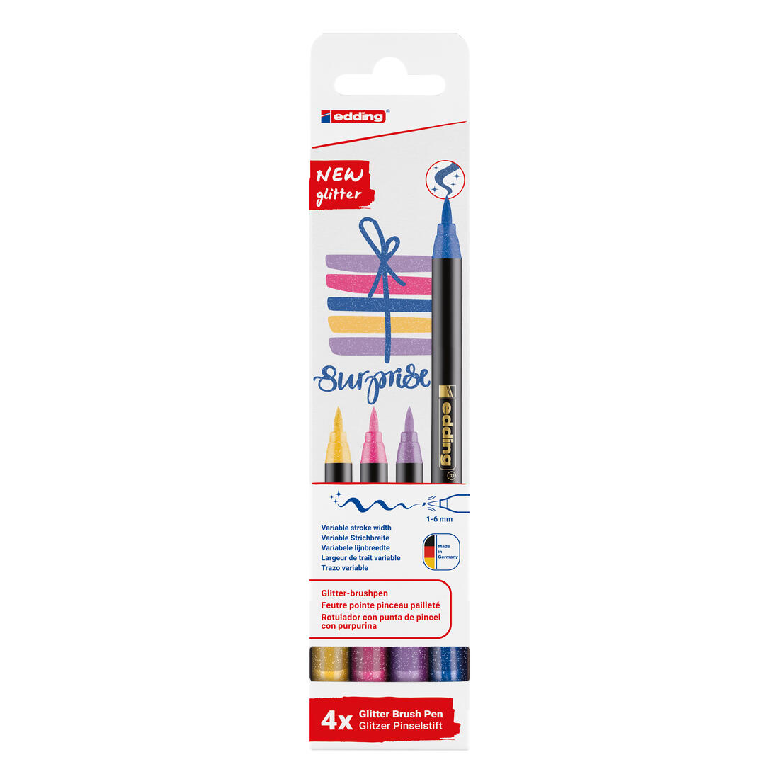 Ontdek de magische wereld van de edding 1340 glitterpennen! Deze unieke brushpennen geven een kleurintensief glittereffect bij het schrijven, tekenen en schilderen. Afhankelijk van het licht toveren de kleuren bijzondere glittereffecten tevoorschijn.