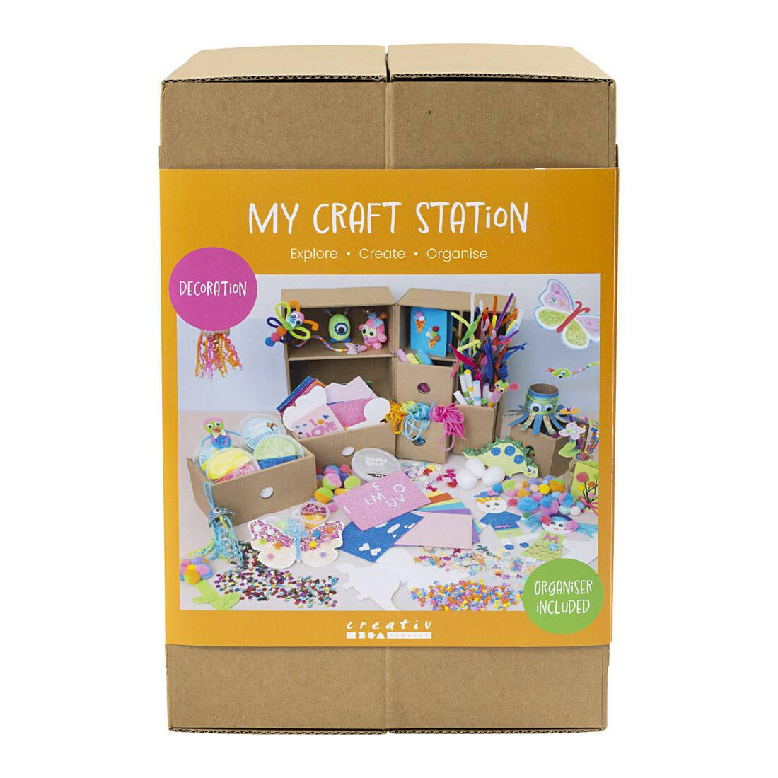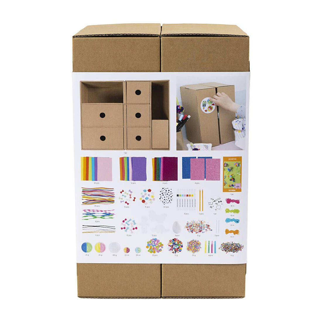 Deze doos bevat alle klassieke decoratieve ontwerpen en meer. Combineer de producten om mooie, leuke en gekke wezens te maken. Maak je eigen zelfgemaakte kartonnen kaarten, toppers met potloden, kleine boeketten, pomponbloemen en nog veel meer. Je kunt ook toiletpapierrollen, eierdozen enzovoort gebruiken om te decoreren. De doos wordt geleverd met uitgesneden vlinder-, dinosaurus- en mensmotieven om zelf te versieren. Teken gezichten met de stiften, maak haar van garen en knip truien, broeken en jurken van EVA foam – de mogelijkheden zijn eindeloos.