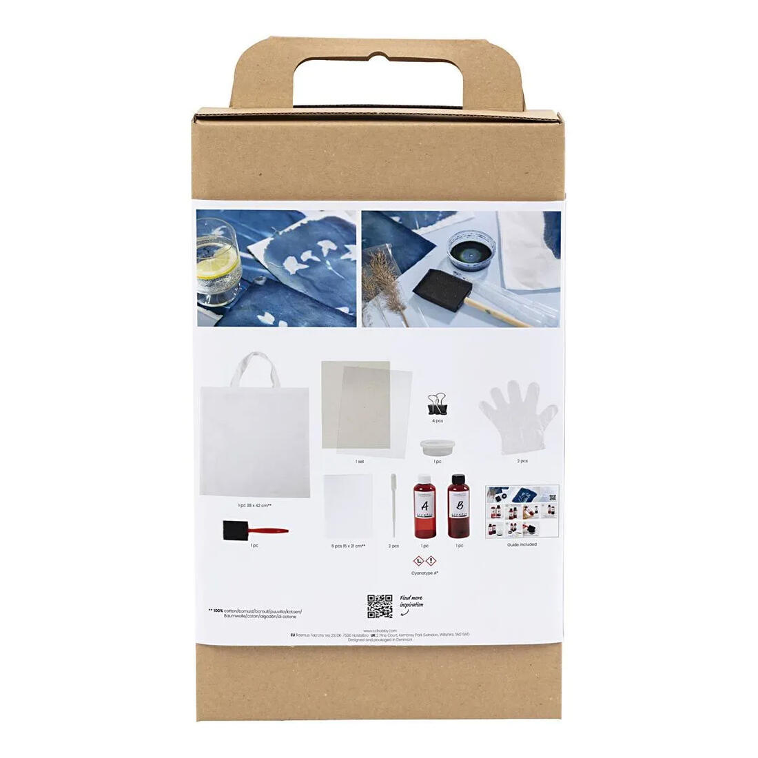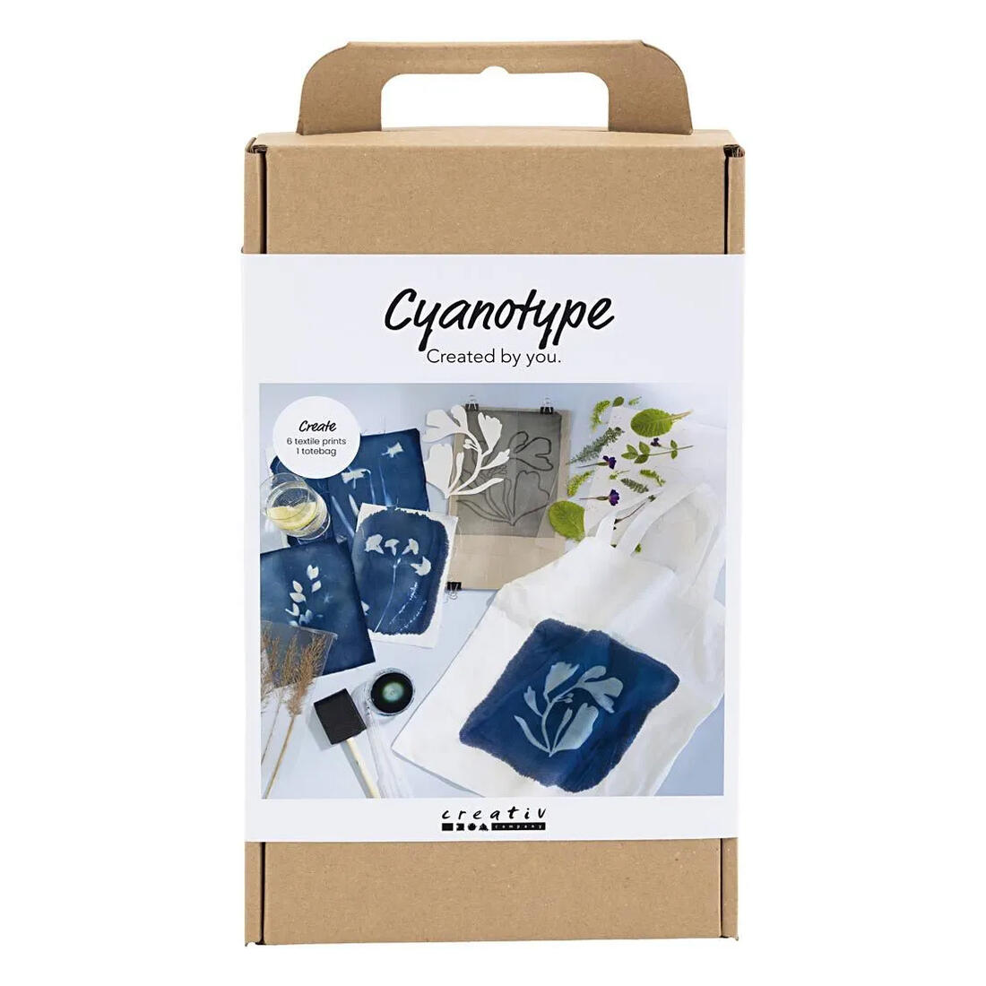 Inhoud: drukpoeder voor cyanotypie, katoenen stof, boodschappentas, schuimborstel, pipet, emmer met deksel, kunststof handschoenen, stevige kunststof plaat, knutselkarton, clips.