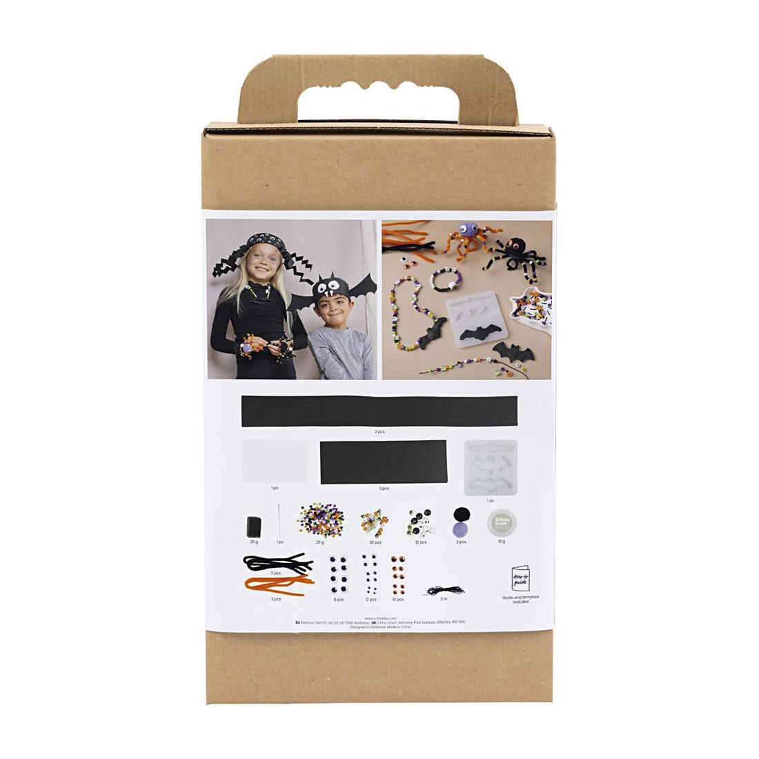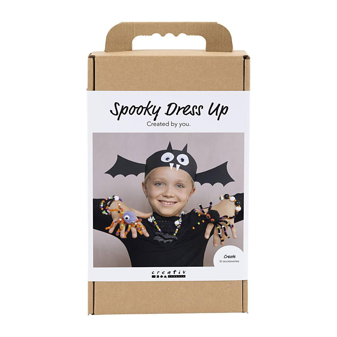 Met deze Creativity in a Box maakt u samen met de kinderen griezelig leuke sieraden en hoeden. Bevat materiaal voor tien creatieve Halloween-accessoires en alle instructies die u nodig hebt.