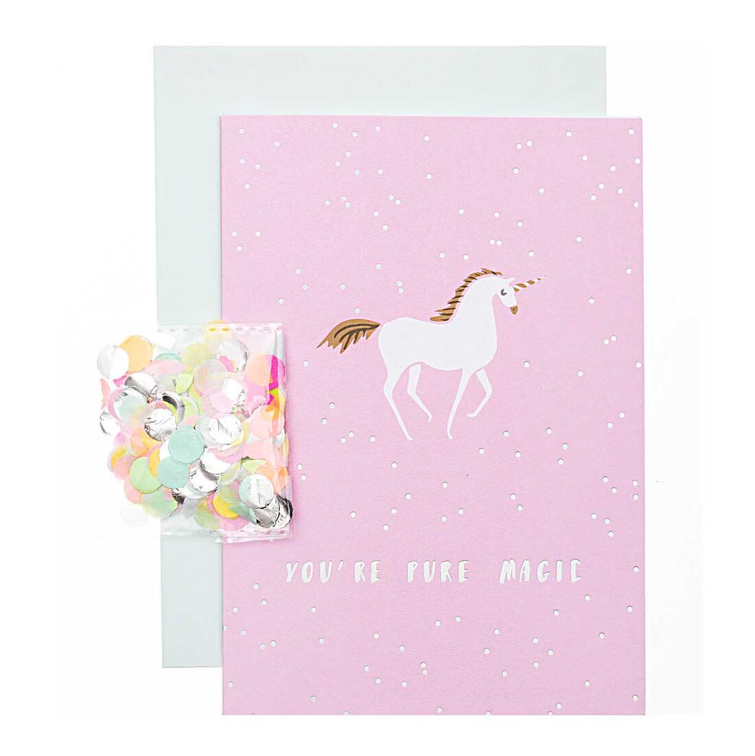 Enveloppe, verschillende stickers (met tekst) en confetti inbegrepen.