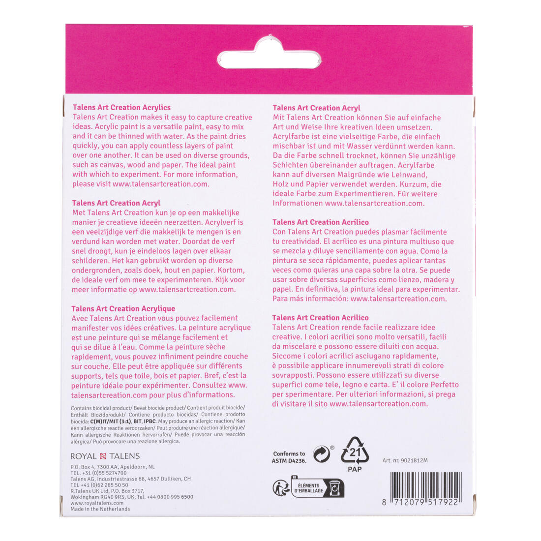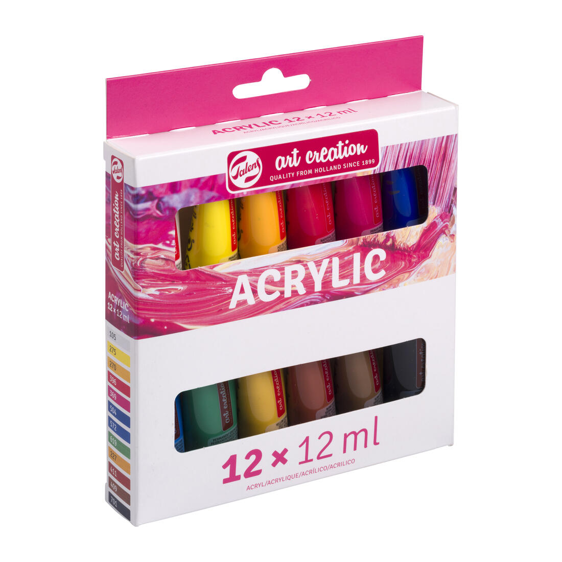 Talens Art Creation acrylverf is een moderne en veelzijdige verf op basis van 100% acrylaathars. De verf is pasteus, droogt zijdeglans op en is snel overschilderbaar. Acrylverf kan je verdunnen met water en droogt snel en watervast op. De kleuren zijn makkelijk te mengen en de verf hecht goed op meerdere ondergronden.